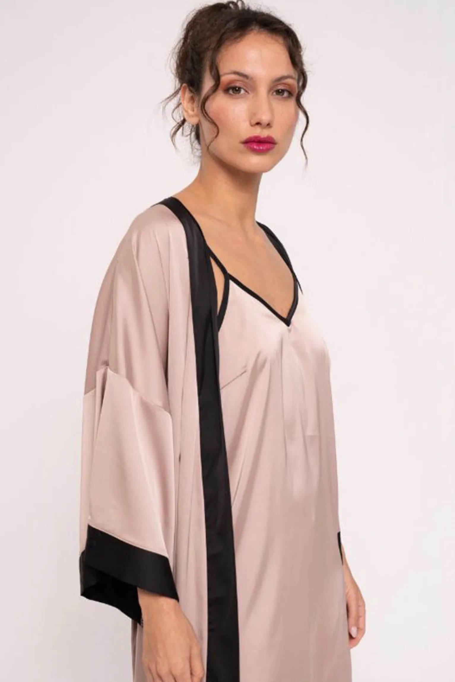 Bata de satén con manga larga. Esta prenda incluye un cinturón para ajustar en la cintura.