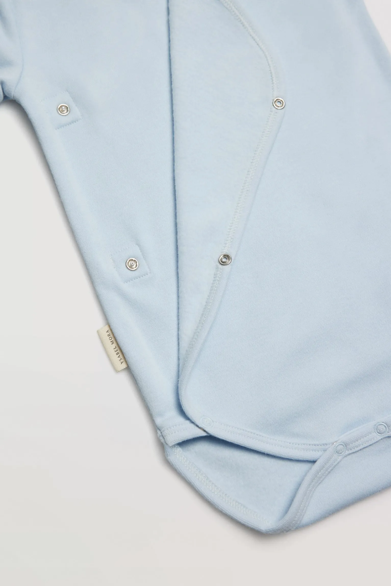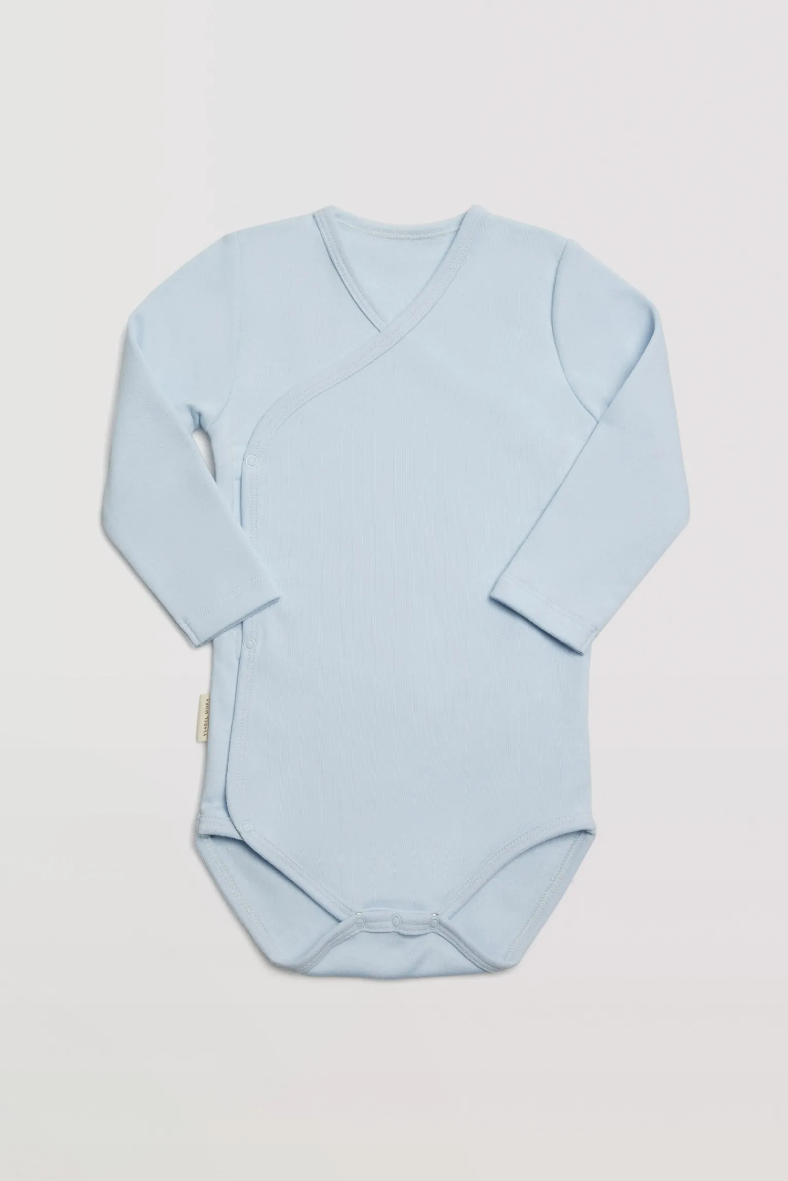 Body de bebé de manga larga con algodón natural. De estilo cruzado, con cuello pico. Prenda confeccionada en un tejido suave y agradable gracias a su interior afelpado. Color azul celeste.