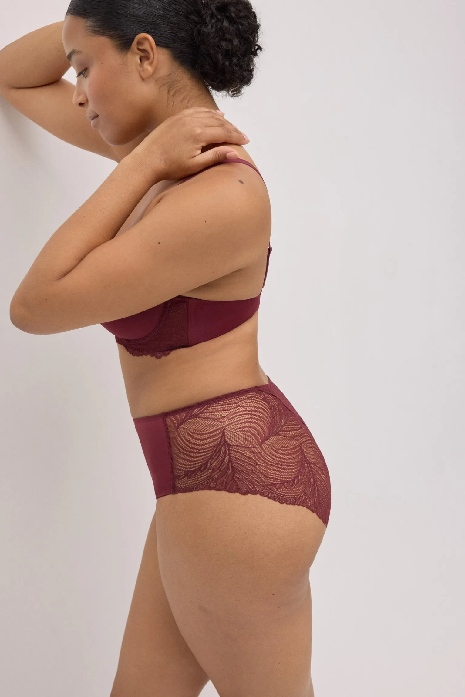 Braga alta de encaje que combina sujeción y sensualidad en una misma prenda. La parte delantera lisa aporta efecto visual más suave en la zona del vientre, mientras que la espalda en encaje semitransparente realza los glúteos con un acabado elegante. El forro interior (crotch) de 100% algodón suma confort y transpirabilidad para el día a día. Combínala con uno de los sujetadores a juego y crea tu propio look de lencería..