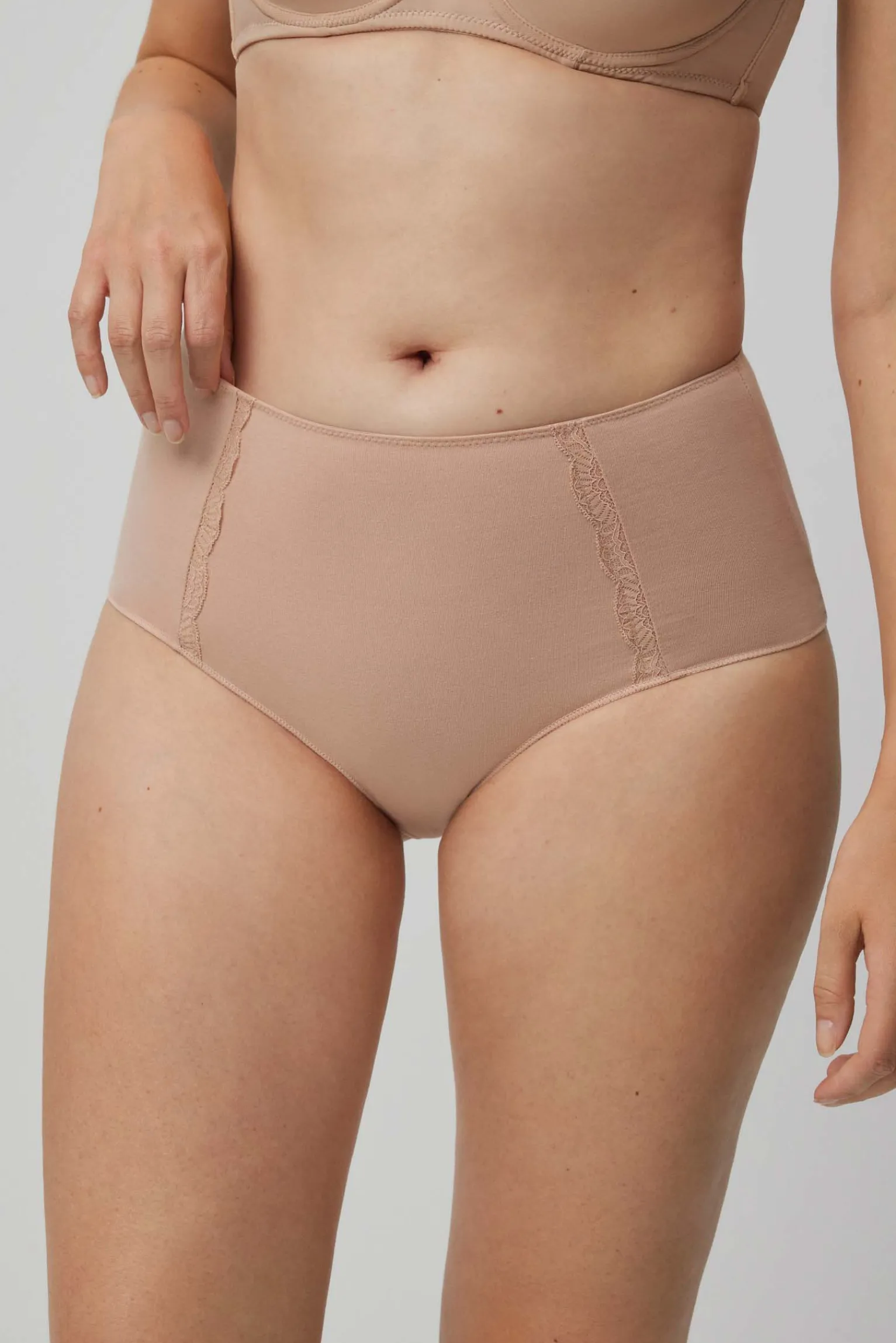 Braga alta en tejido Cotton Nature. Las fibras naturales de este material aportan un extra de suavidad a la prenda. Sus acabados con costuras planas invisibles evitan las marcas y favorecen una mayor adaptabilidad y un ajuste ergonómico perfecto. Modelo básico de gran confort pensado para el día a día. Decoradas con blonda en los laterales. Confeccionadas con material antialergénico.