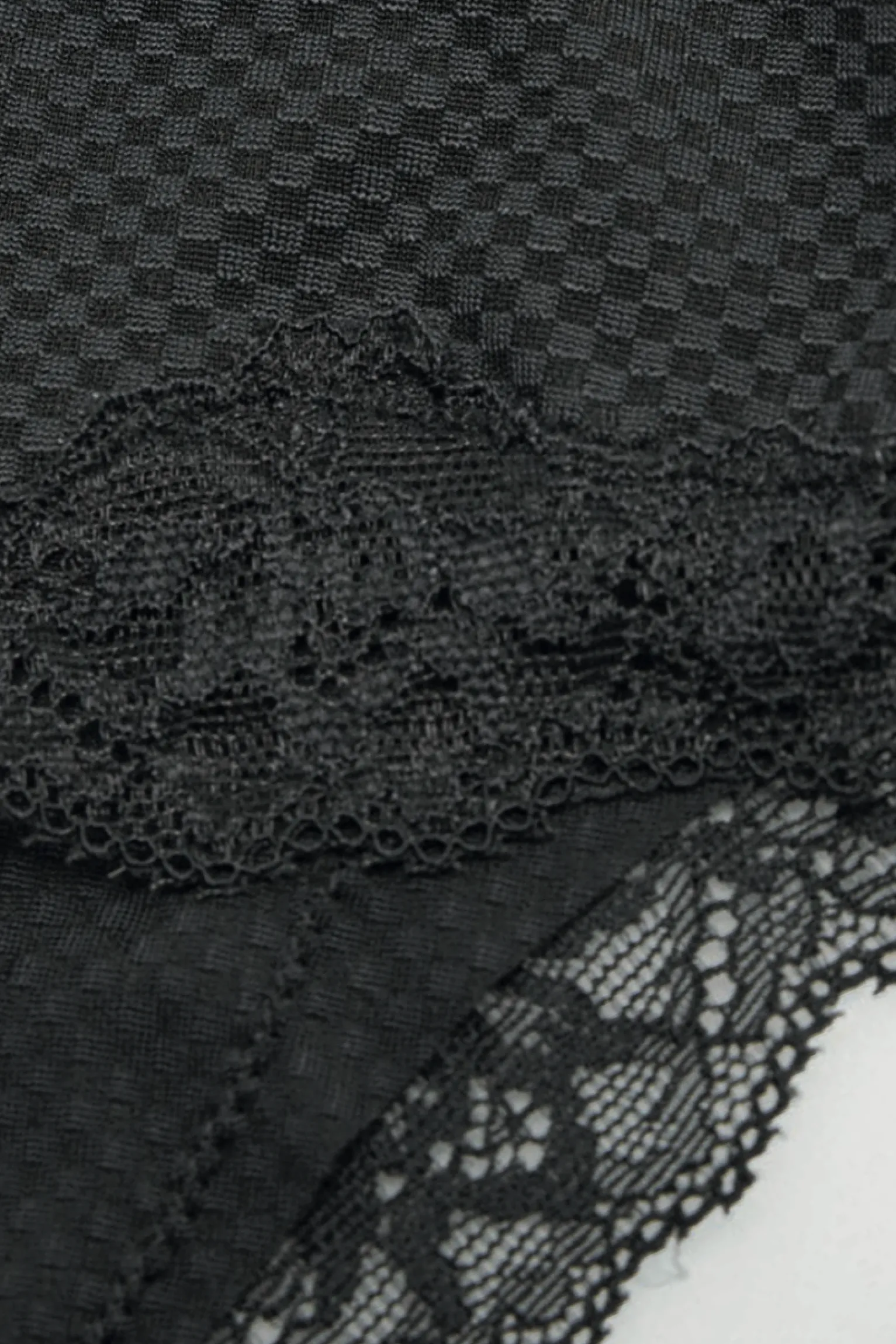 Braga de cobertura midi de lencería en color negro. Textura de cuadros jacquard con bordes de delicado encaje.