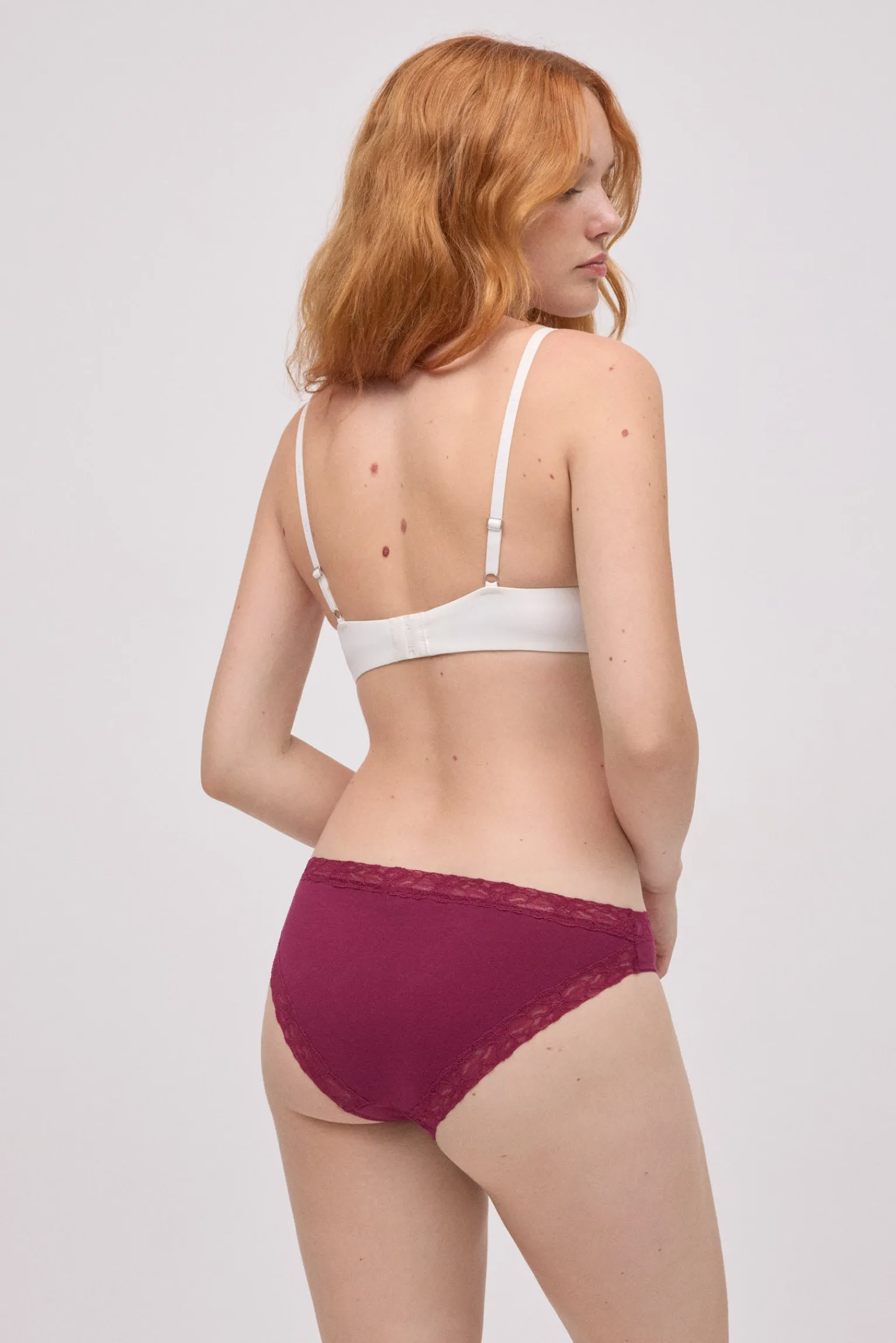 Braga mini confeccionada en algodón natural para ofrecer suavidad, adaptabilidad y transpirabilidad. Su diseño liso se completa con delicados detalles de encaje en la cintura y los contornos, aportando un acabado femenino y elegante ideal para el uso diario.