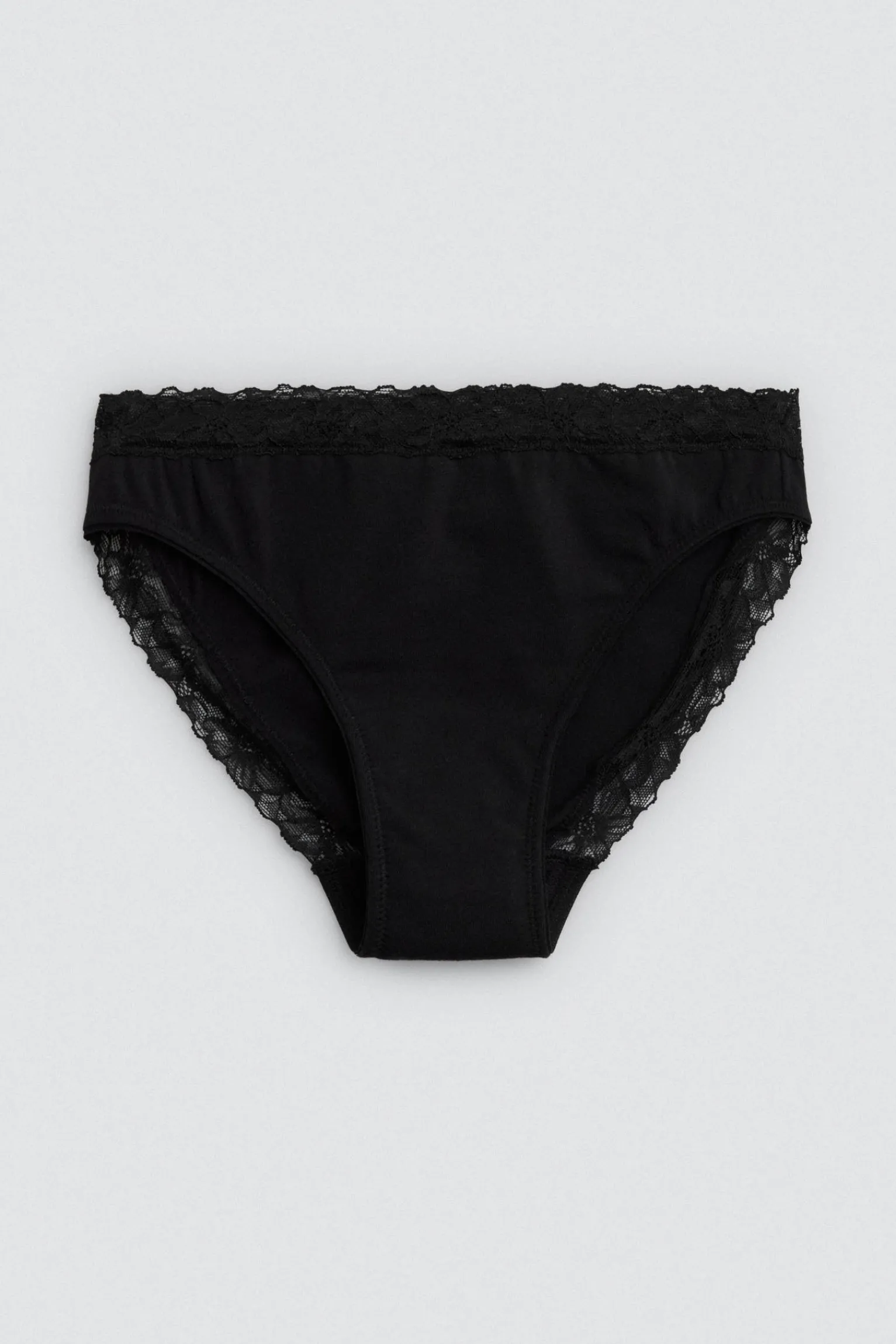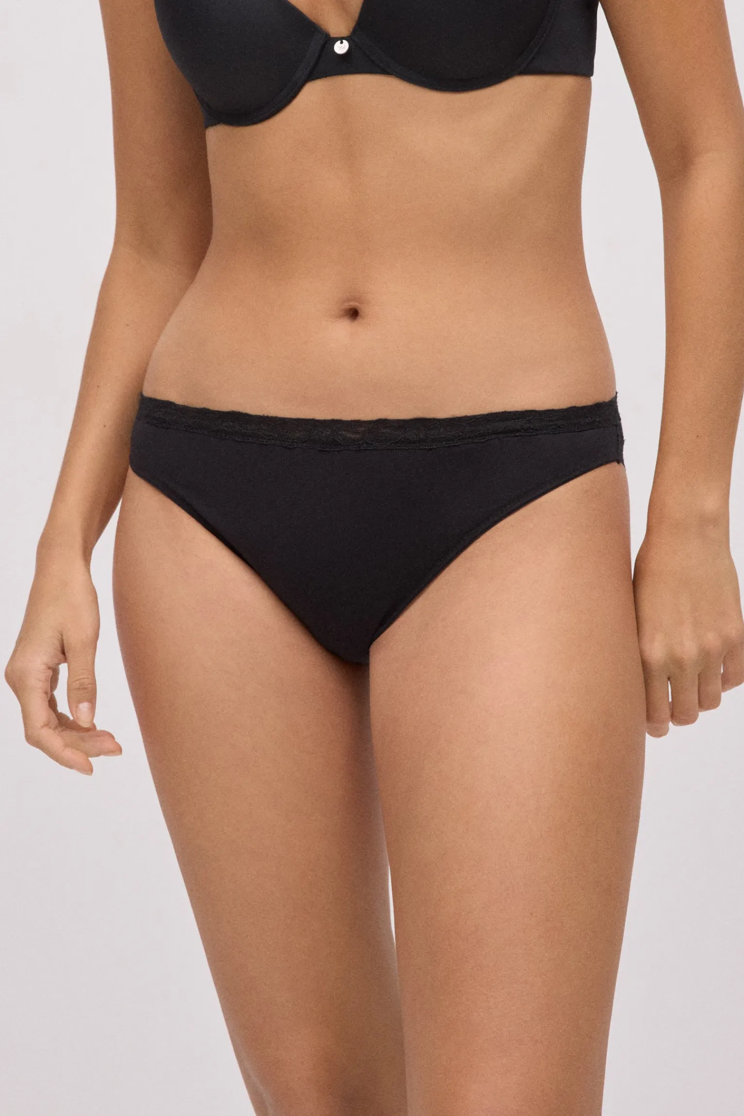Braga mini confeccionada en algodón natural para ofrecer suavidad, adaptabilidad y transpirabilidad. Su diseño liso se completa con delicados detalles de encaje en la cintura y los contornos, aportando un acabado femenino y elegante ideal para el uso diario.