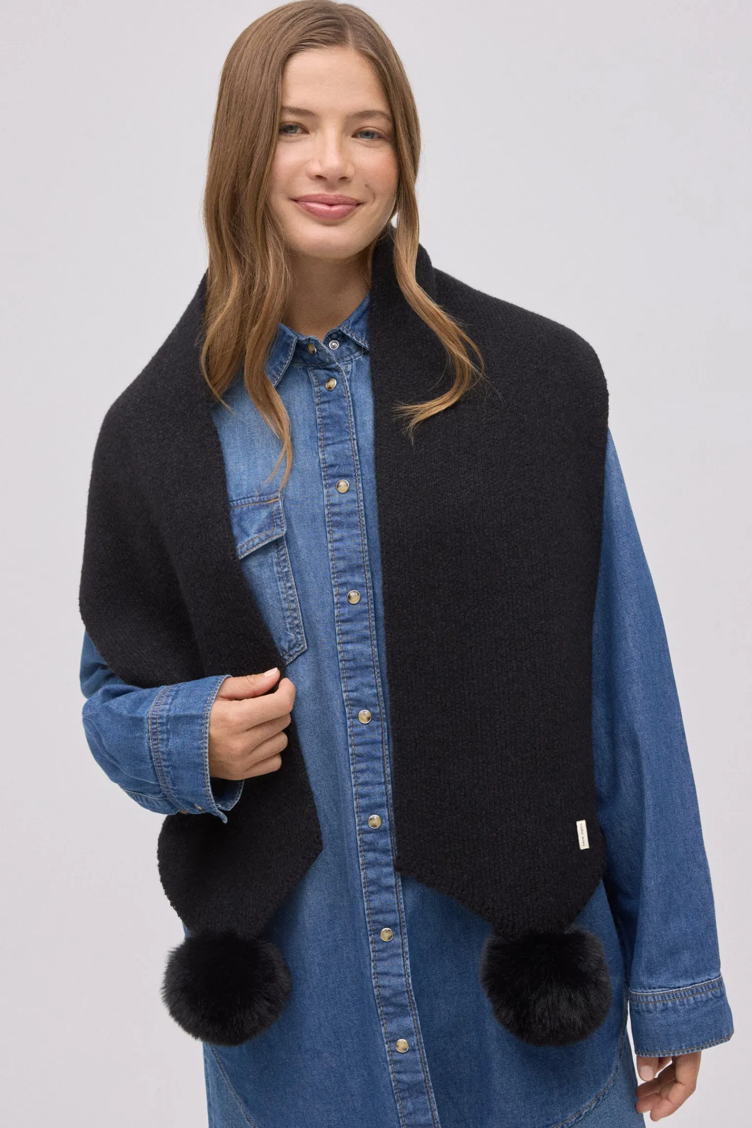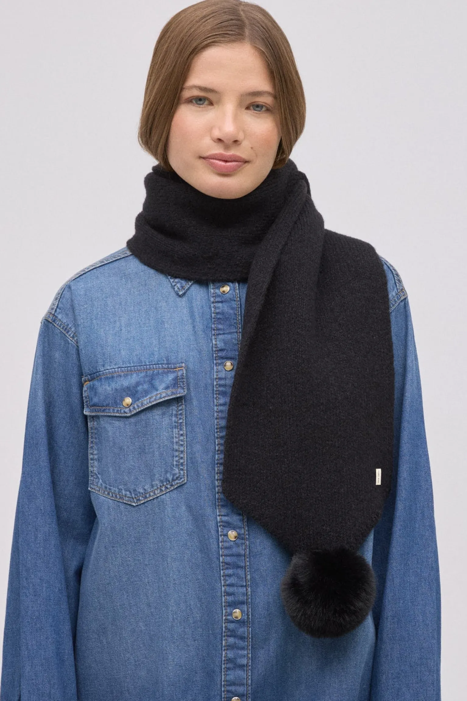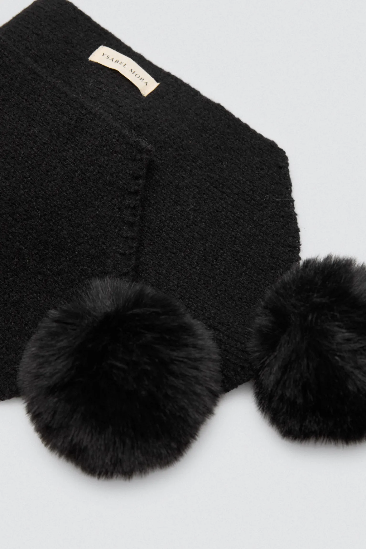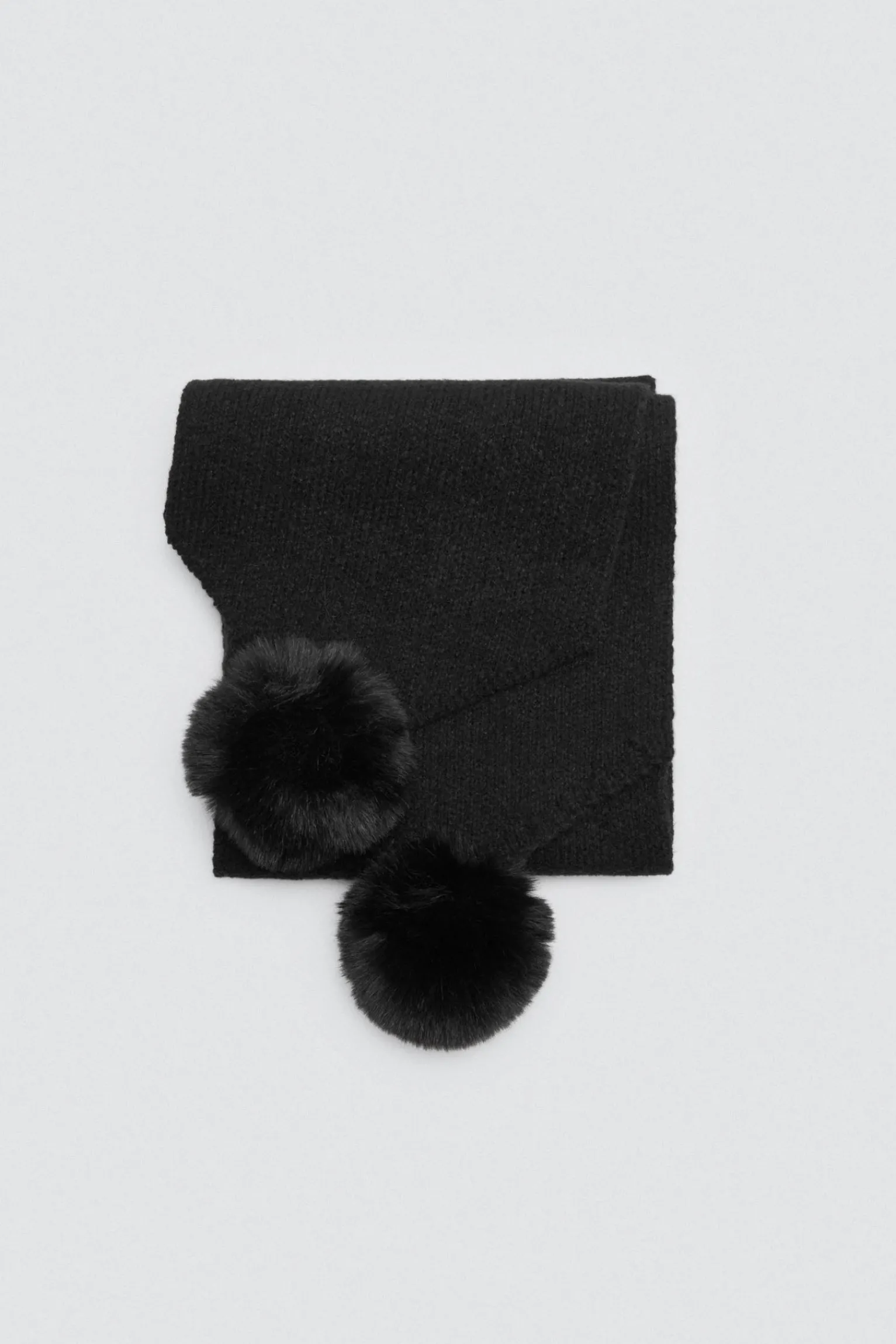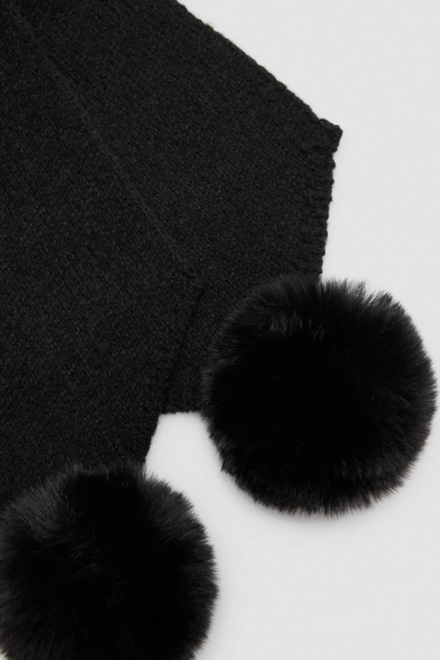 Bufanda negra de punto con detalles de pompones en los extremos.
