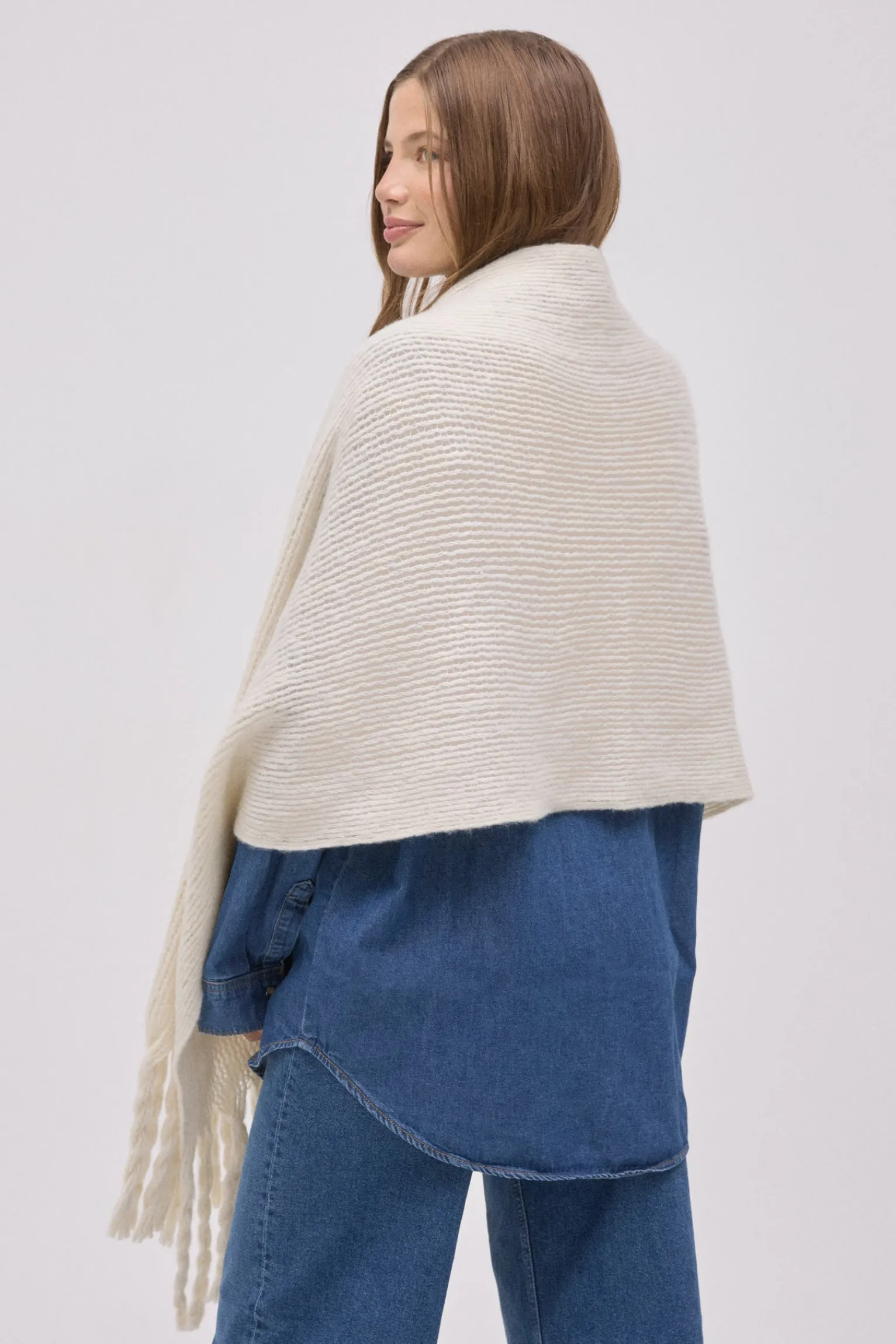 Bufanda lisa tipo pashmina con textura suave y flecos. Color beige.