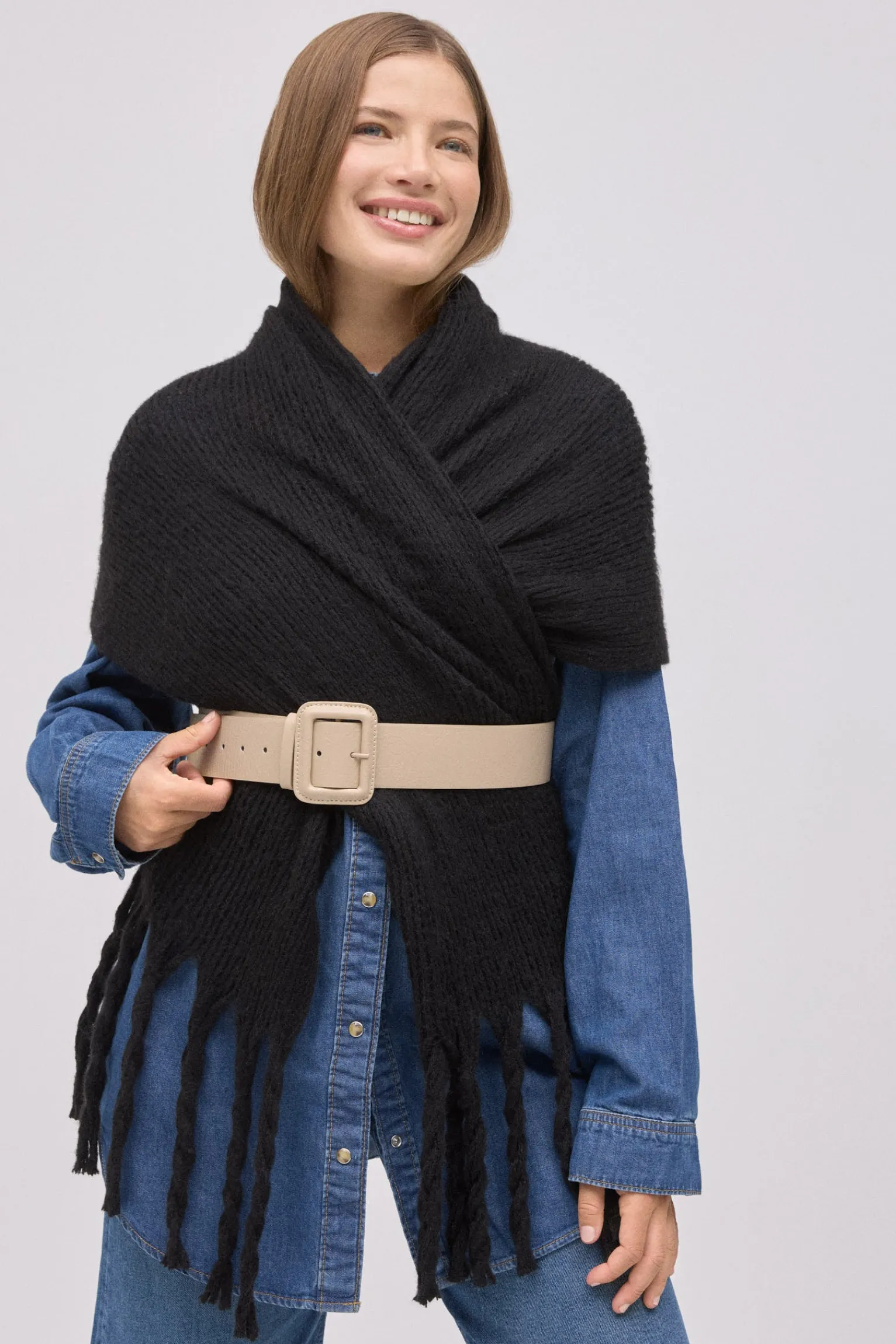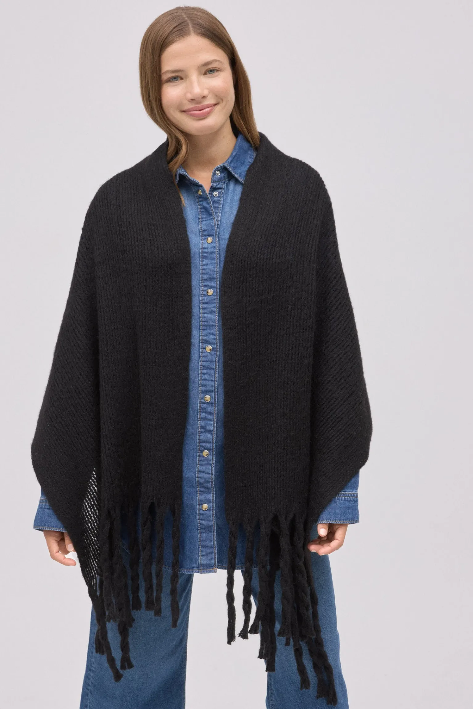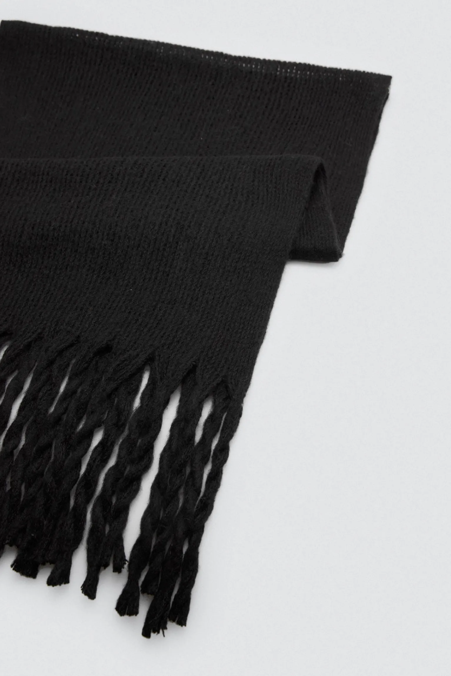 Bufanda lisa tipo pashmina con textura suave y flecos. Color negro.