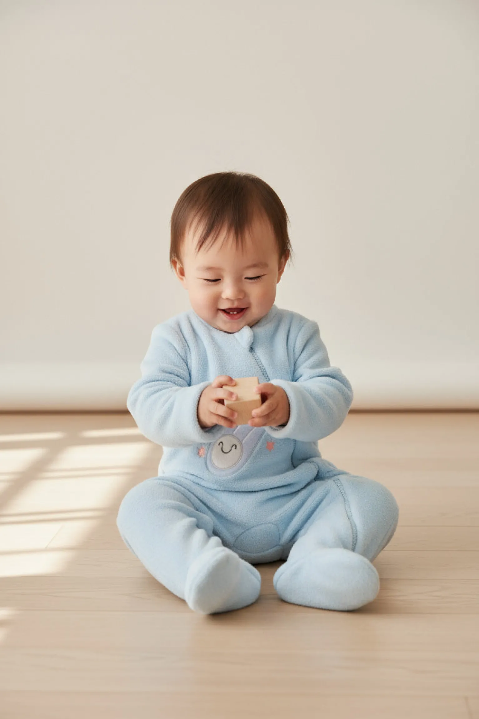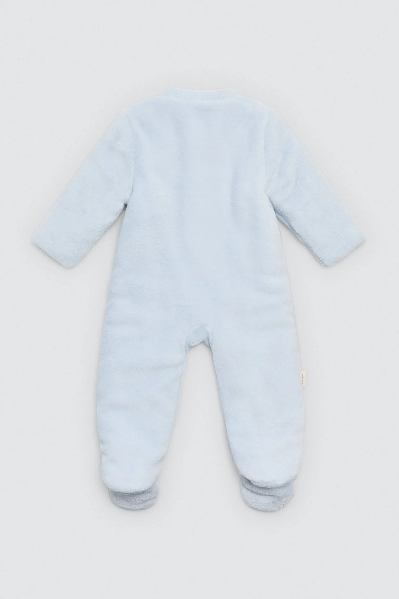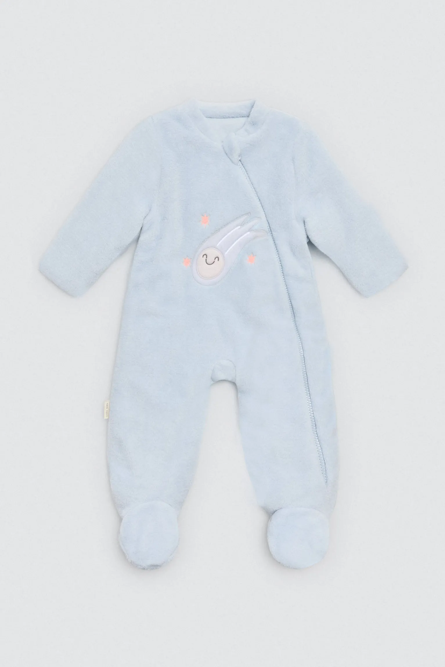 Buzo acolchado para bebé en color azul con interior afelpado. Con cierre de cremallera completa para mayor comodidad al vestir. Ideal para mantener al bebé abrigado en invierno. Diseño con estrellas, práctico para cochecito o paseo.