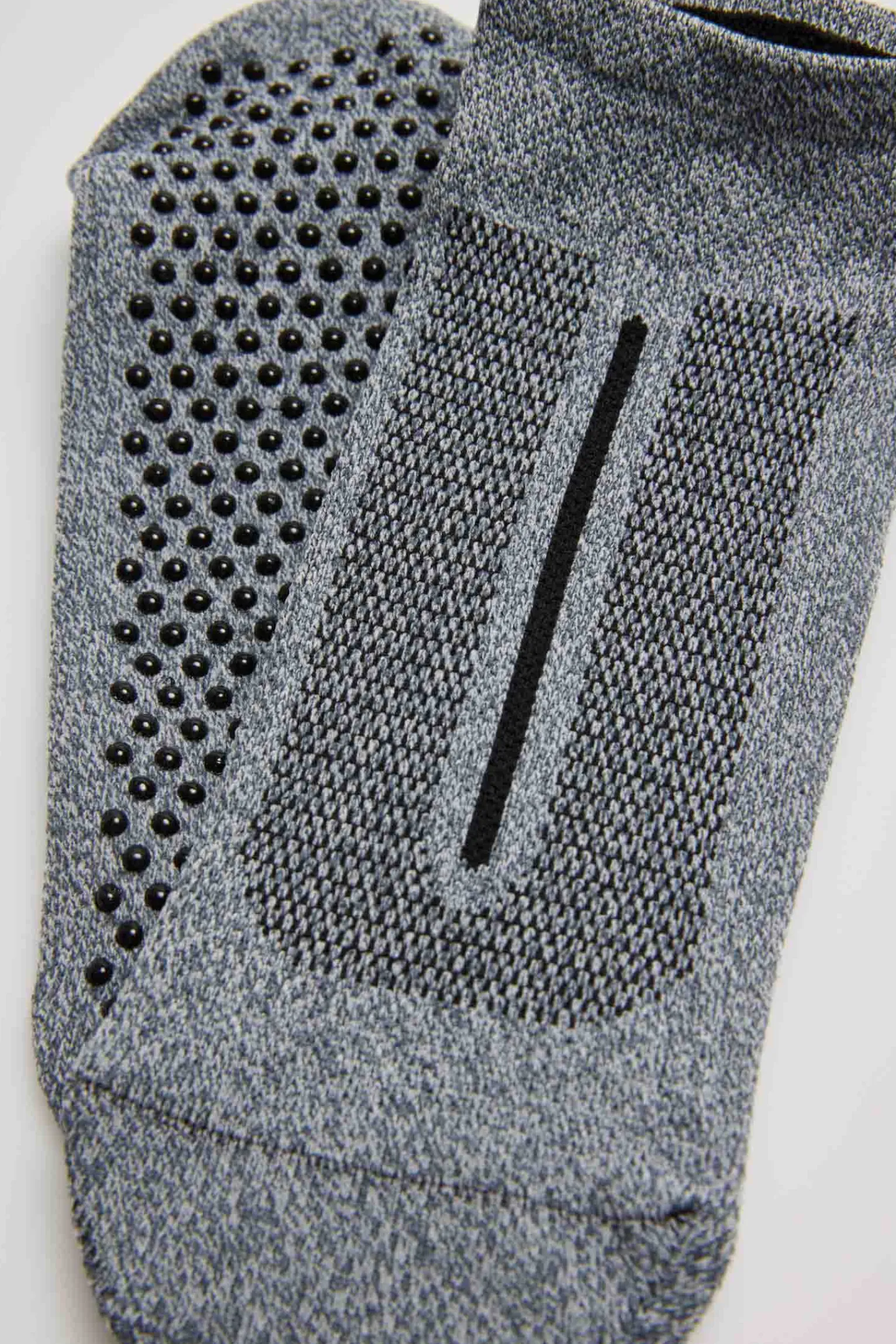 La silicona en la suela está estratégicamente colocada para brindar un agarre seguro en diferentes tipos de superficies, ya sea en colchonetas de yoga, pisos de madera o esteras de pilates. Esto permite a los practicantes centrarse plenamente en su práctica, sin distracciones ni preocupaciones por resbalones.