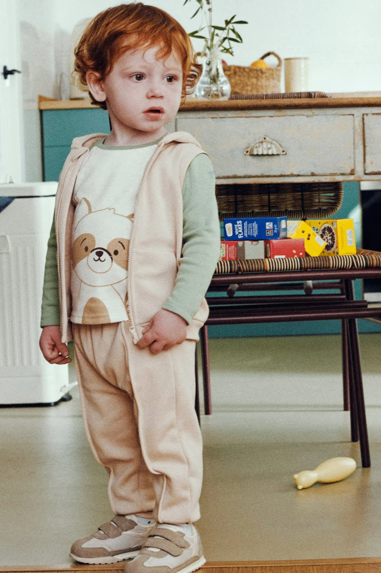 Conjunto de bebé para otoño compuesto por camiseta de manga larga con dibujo de zorro, pantalón largo y chaleco afelpado. Elaborado en algodón natural con interior afelpado suave, ideal para mantener al bebé abrigado.