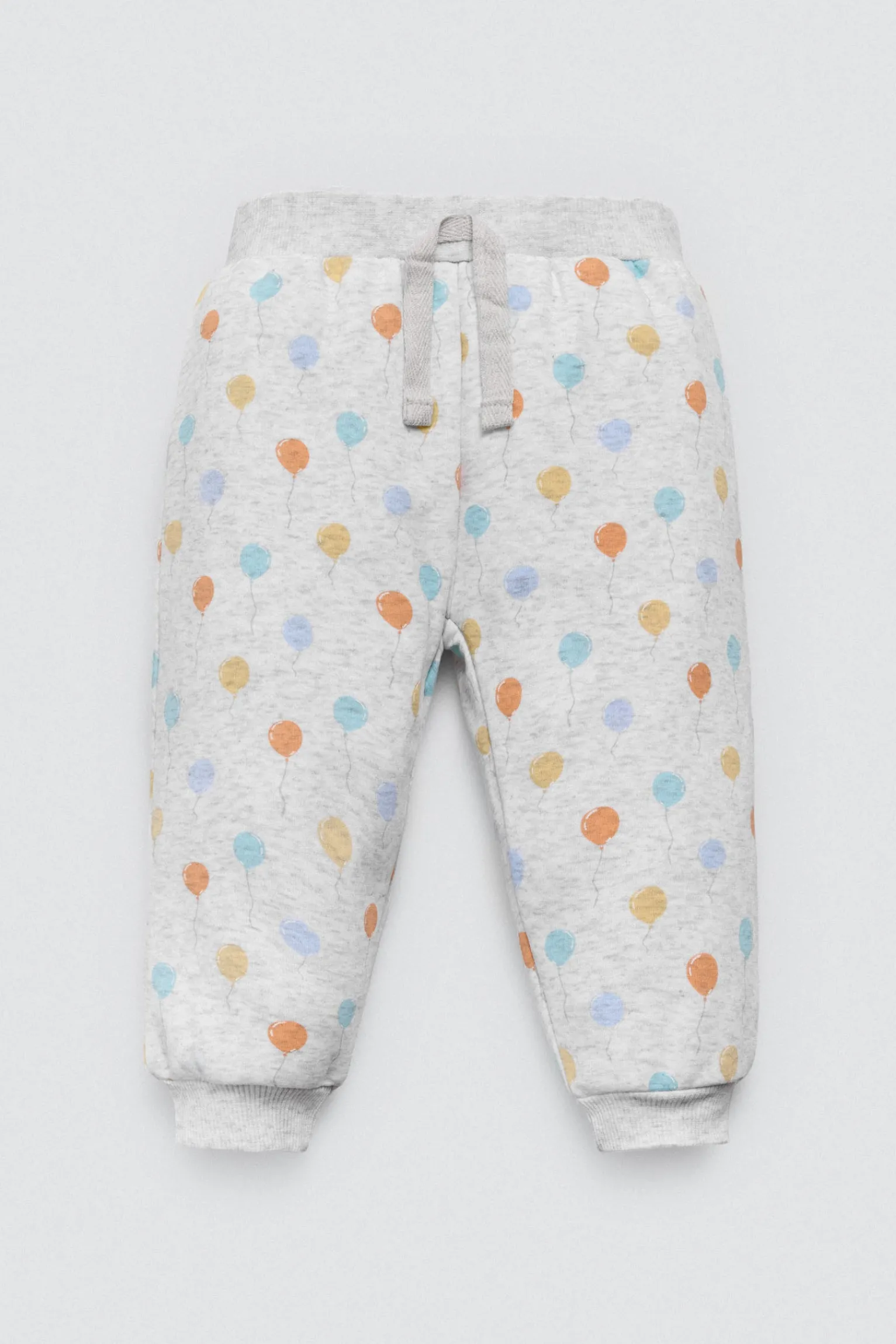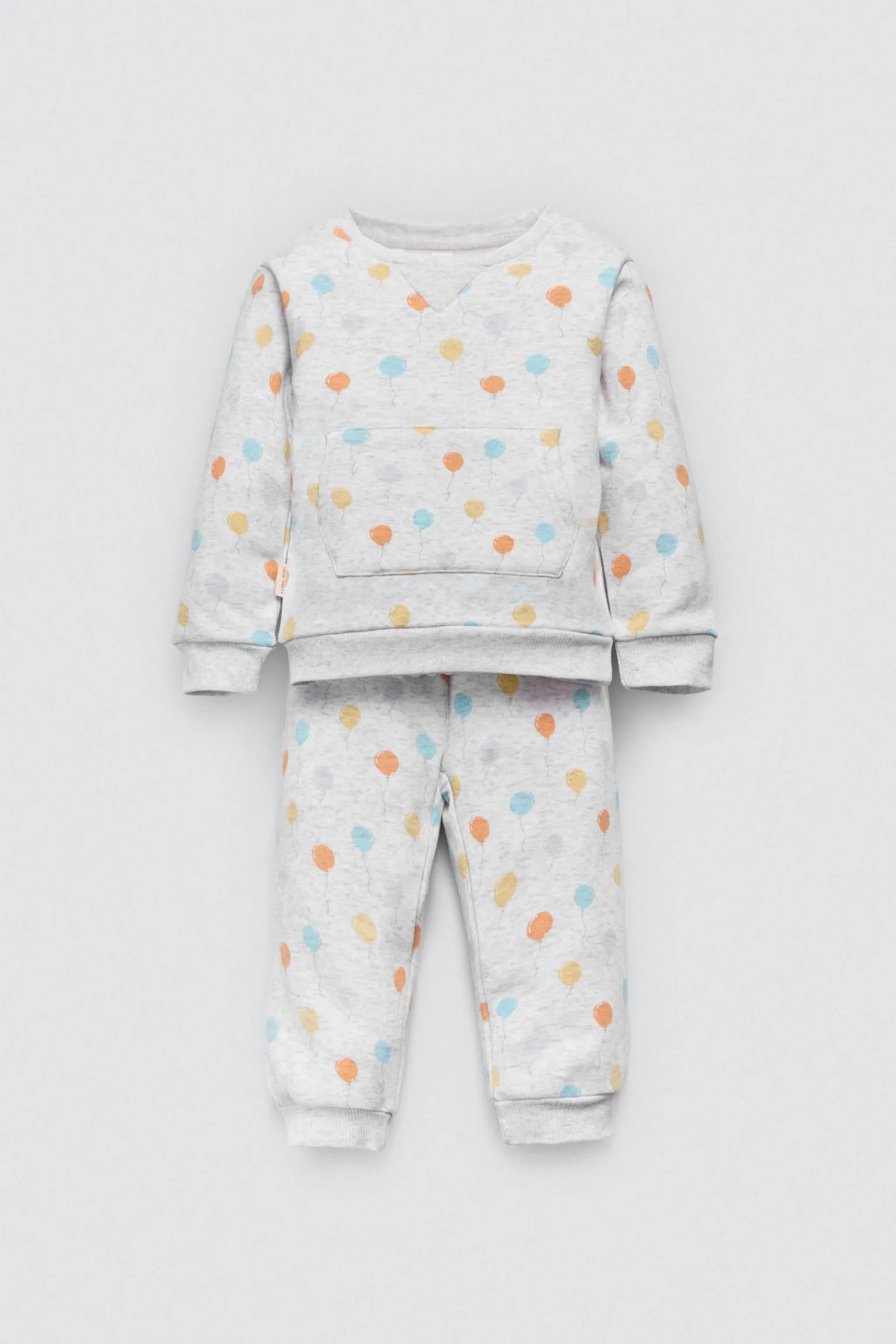 Chándal de bebé. Sudadera de manga larga estampada con globos y bolsillo canguro. Pantalón largo con cinturilla elástica ajustable. Interior afelpado que aporta calor sin perder libertad de movimiento. Ideal para jugar y explorar.
