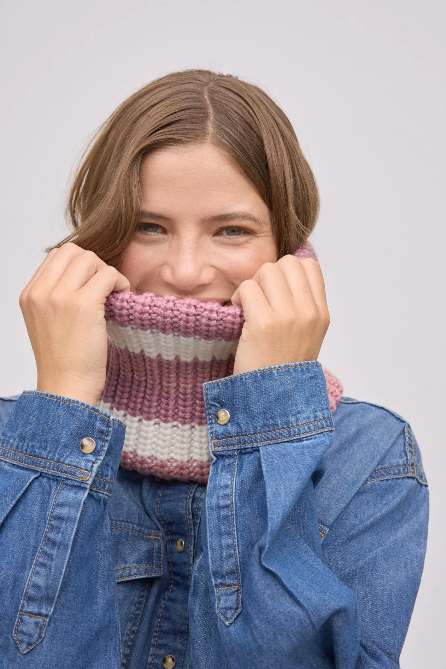 Cuello tipo bufanda infinity con diseño a rayas. Se adapta cómodamente al cuello, ideal para llevar con abrigos o chaquetas.