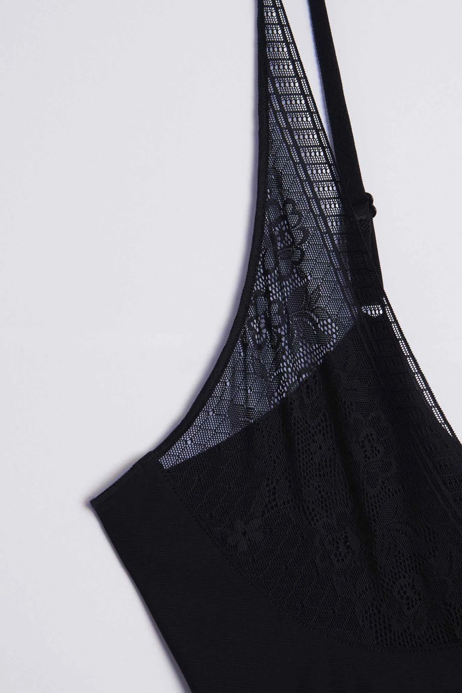 - Detalle de encaje floral: en la zona del pecho, aporta un toque elegante y femenino.