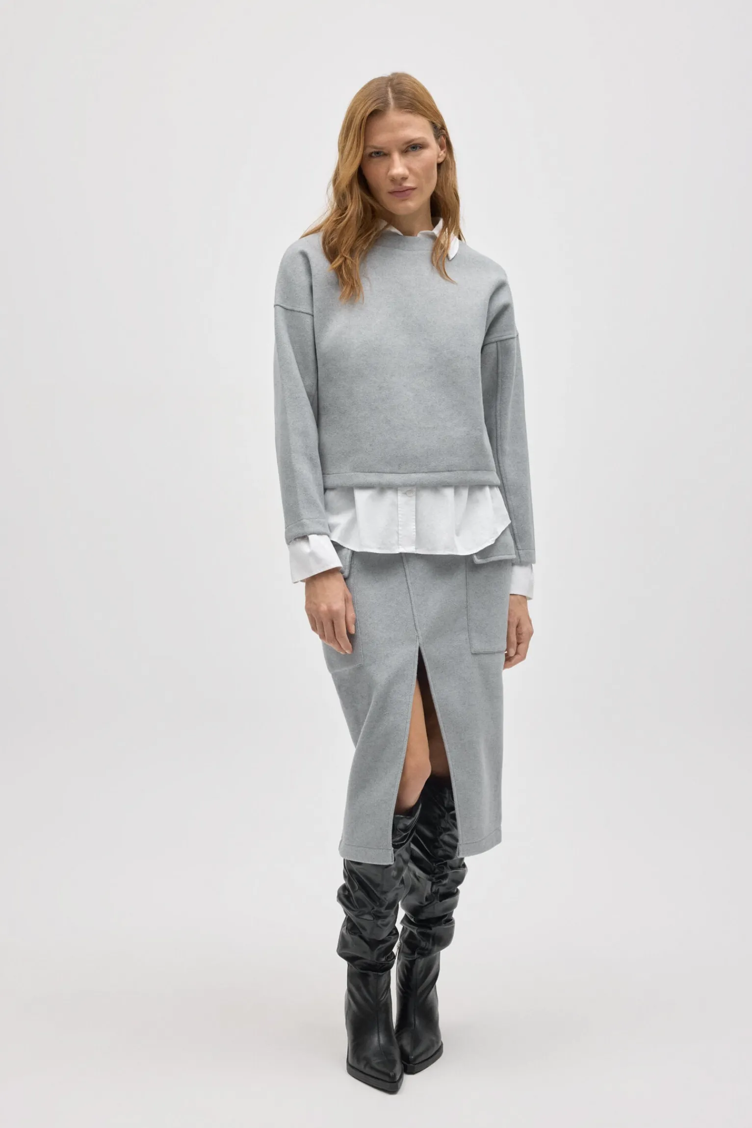 Esta falda combina un diseño elegante con detalles funcionales, perfecta para un look moderno y cómodo. Su corte midi, abertura en el centro y bolsillos laterales le dan un toque de estilo único, mientras que su tejido cálido te mantiene cómoda todo el día. Ideal para completar tu conjunto con el jersey a juego.