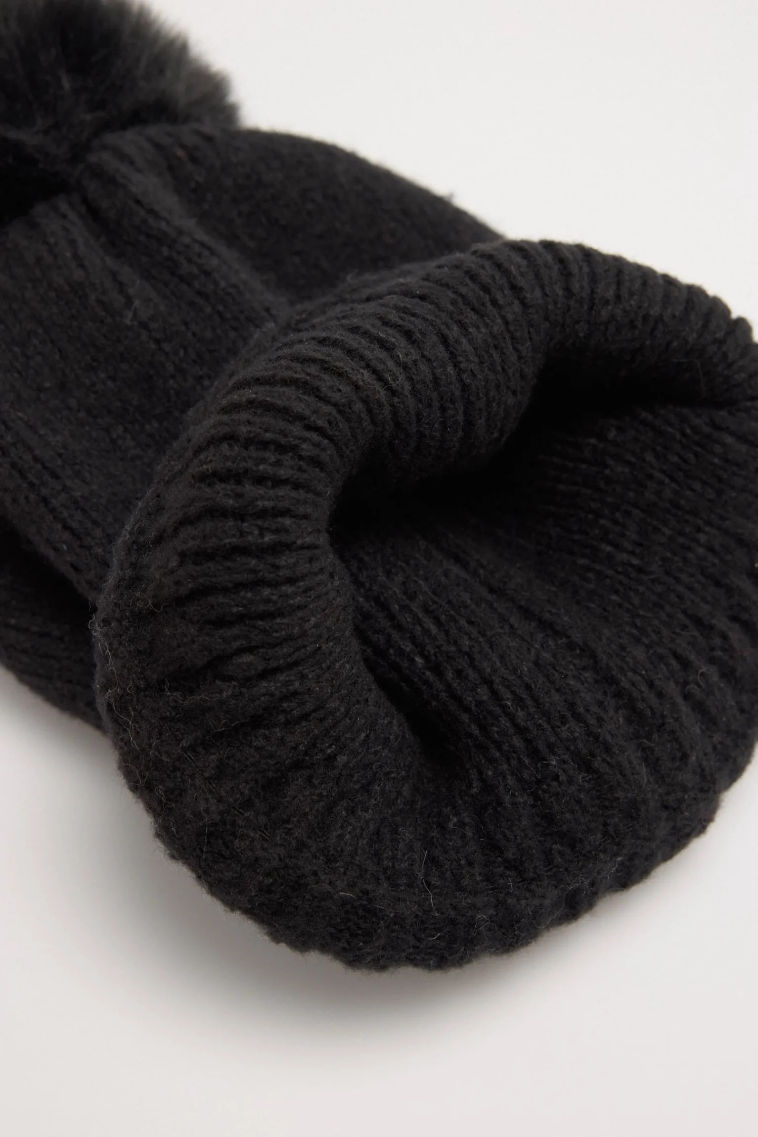 Gorro de punto suave con gran pompón en color negro. Ideal para mantenerte abrigada con un look minimalista y actual.
