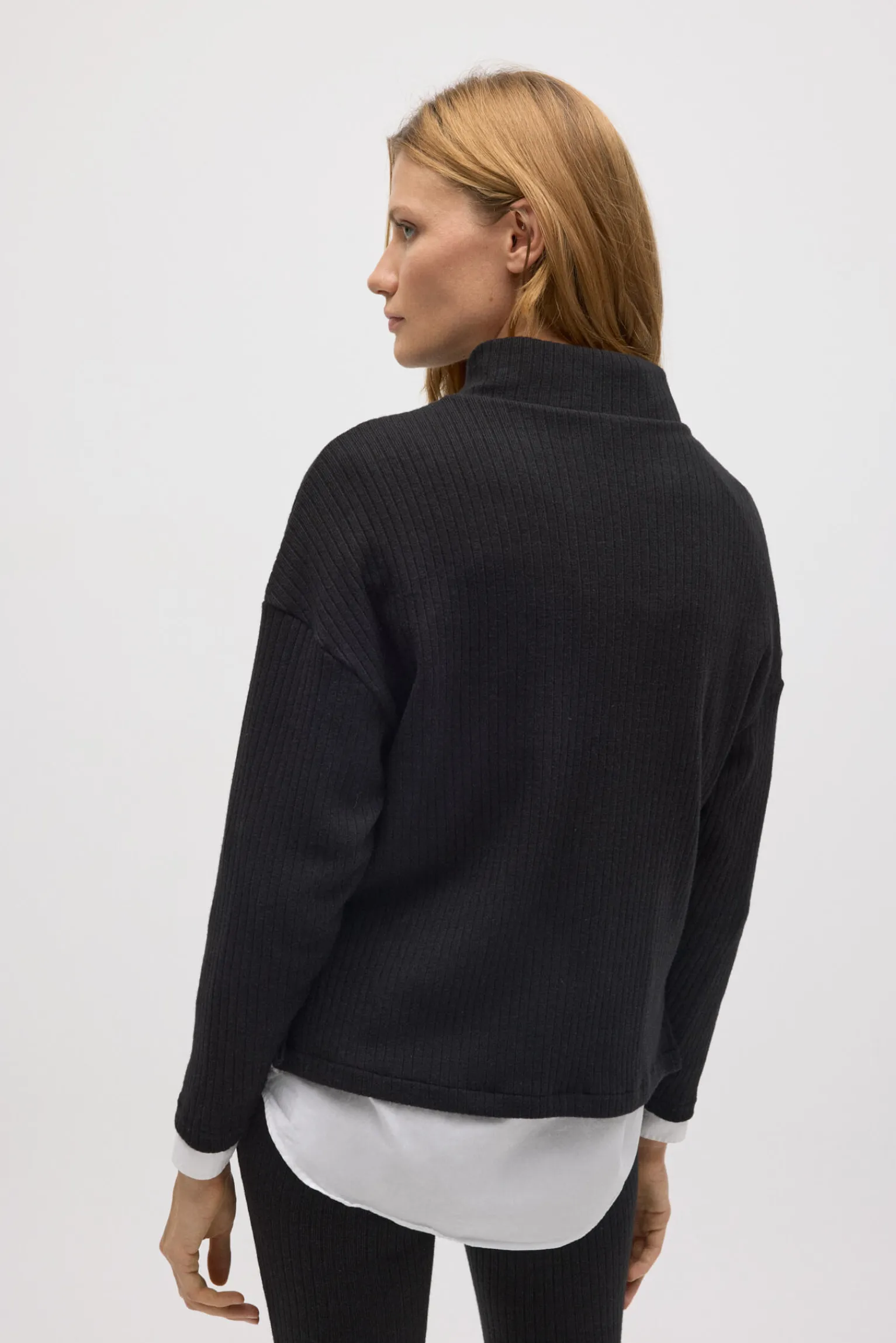 Este jersey cálido de punto canalé con cuello es una opción versátil para los días más fríos. Su textura de canalé aporta un toque delicado y moderno, mientras que su corte amplio lo convierte en una prenda extremadamente cómoda. Pensado para quienes buscan ropa cómoda y con estilo para el día a día.