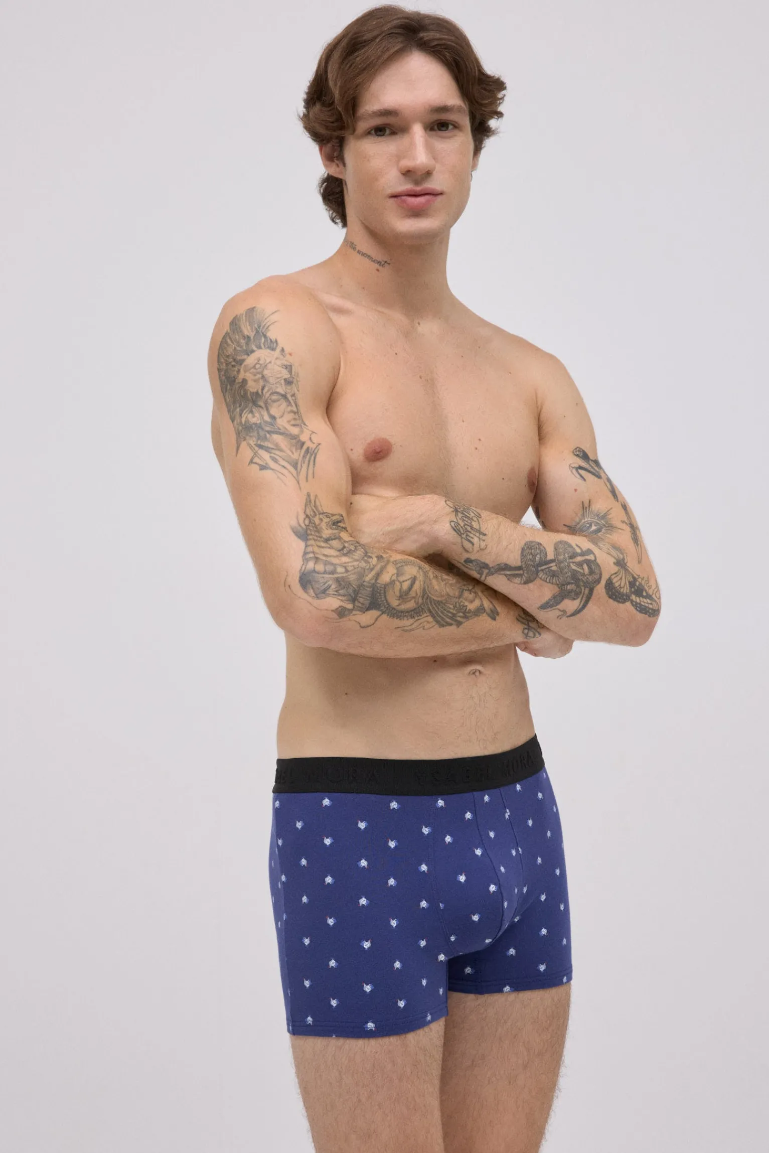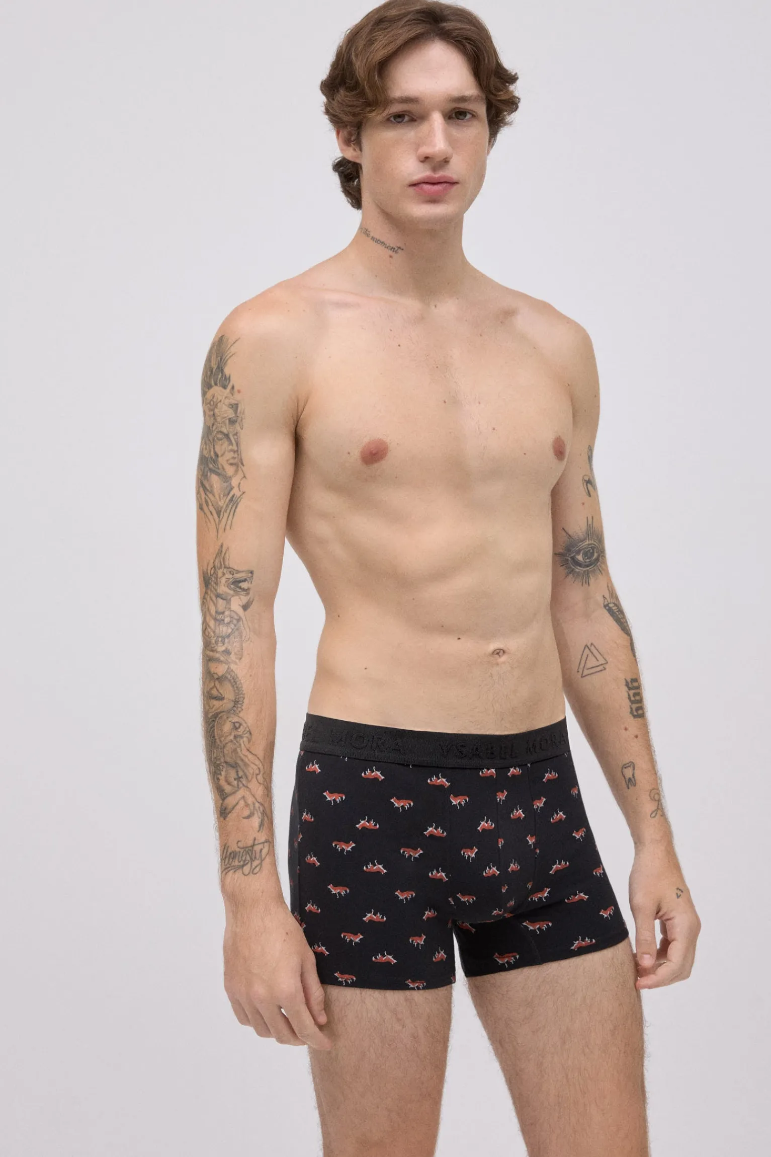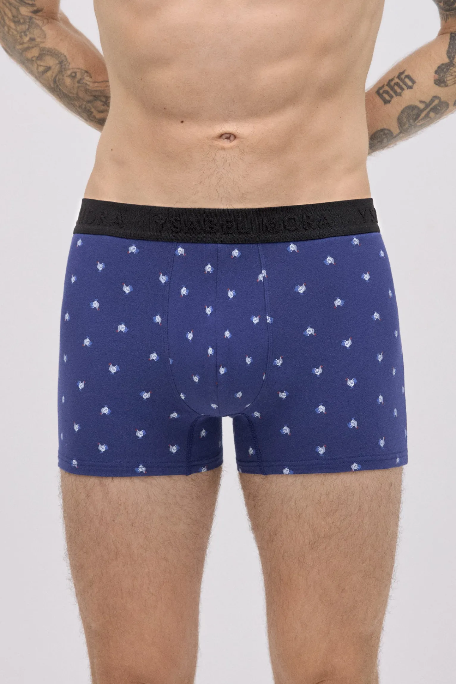 Pack de 2 bóxers estampados de Ysabel Mora confeccionados en algodón natural con un toque de elastano para un ajuste cómodo. Cada modelo presenta un estampado animal diferente: uno en color negro con zorros y otro en azul con gallos. La cinturilla elástica negra con el logo de la marca aporta sujeción y un acabado distintivo.