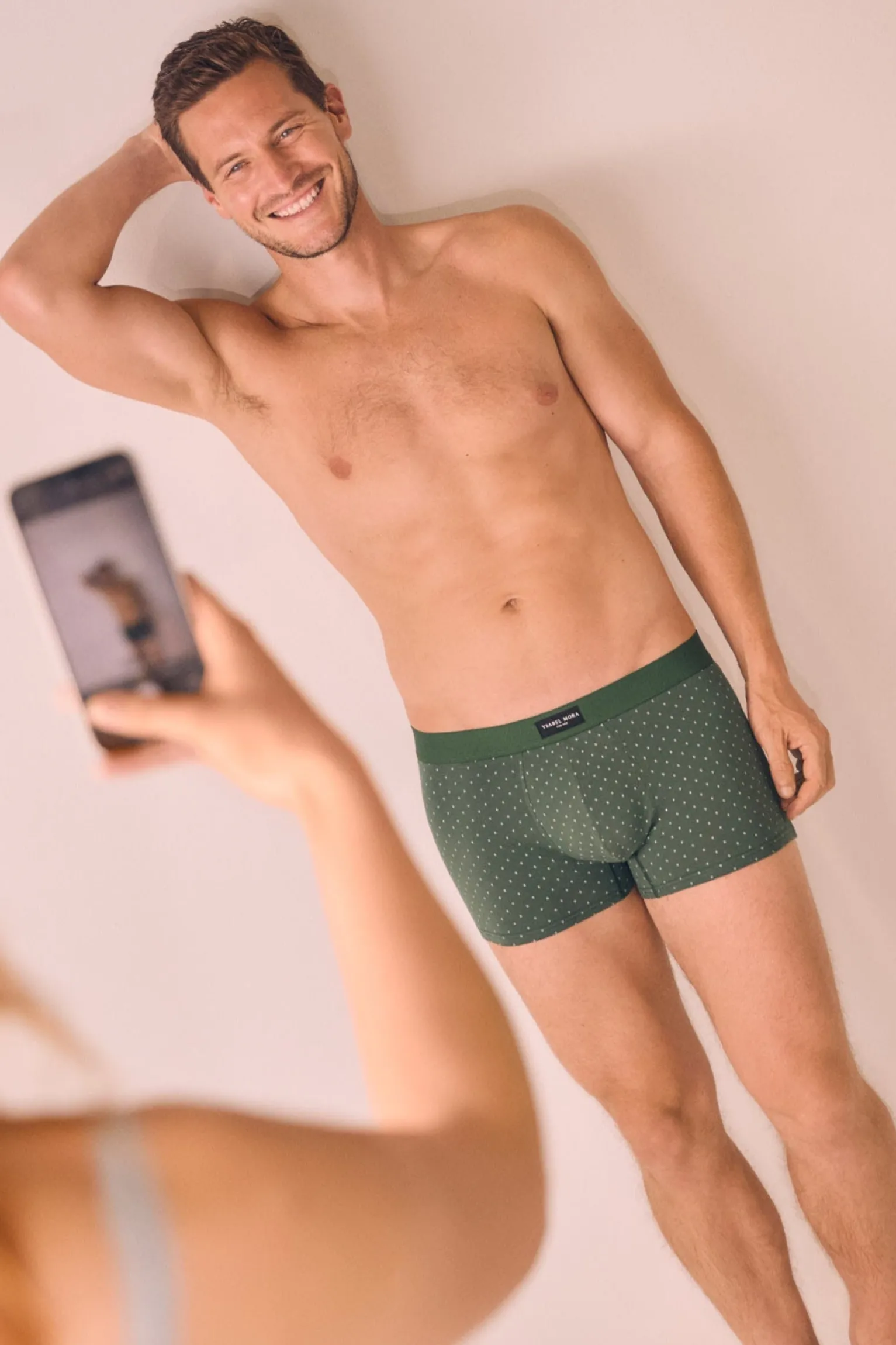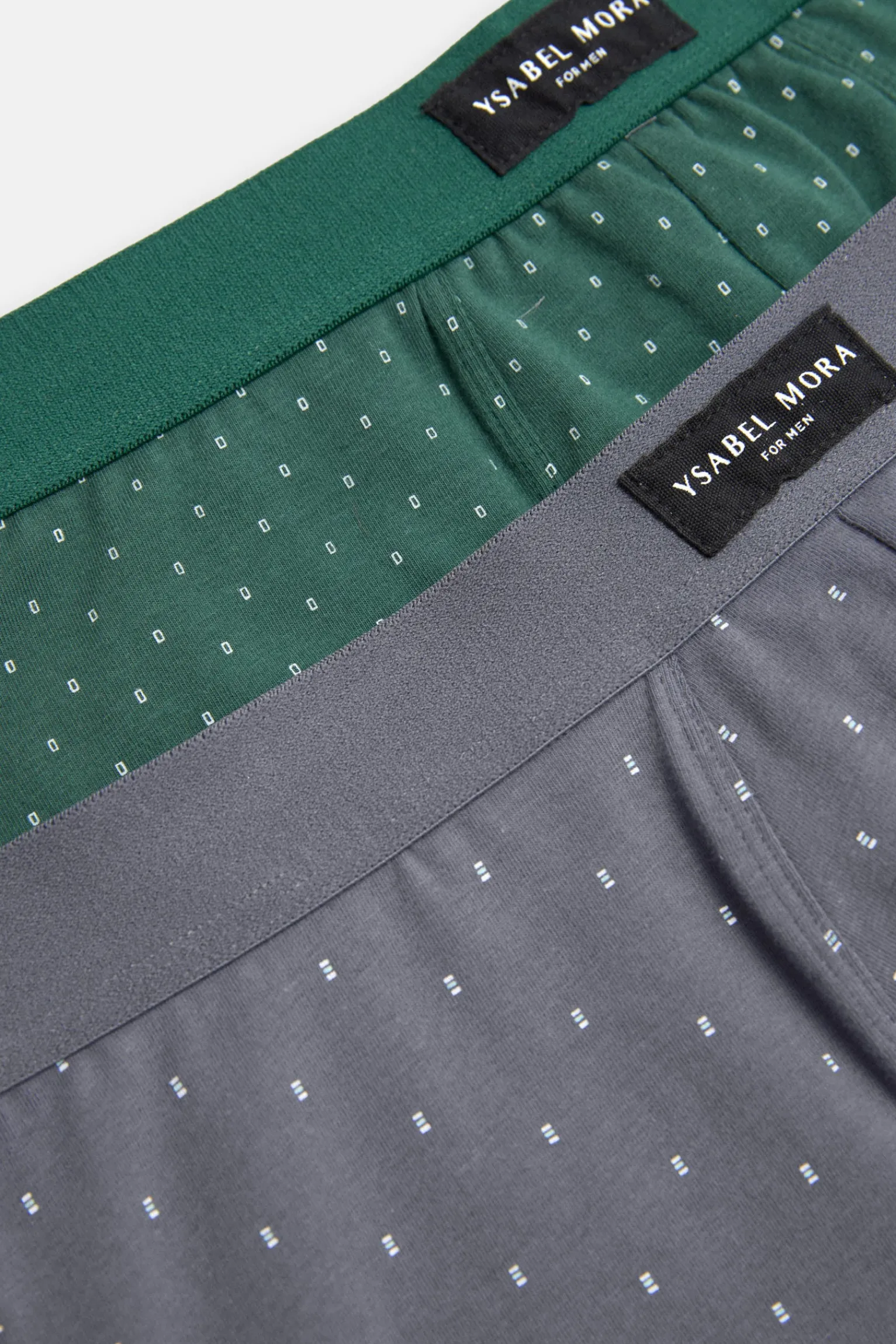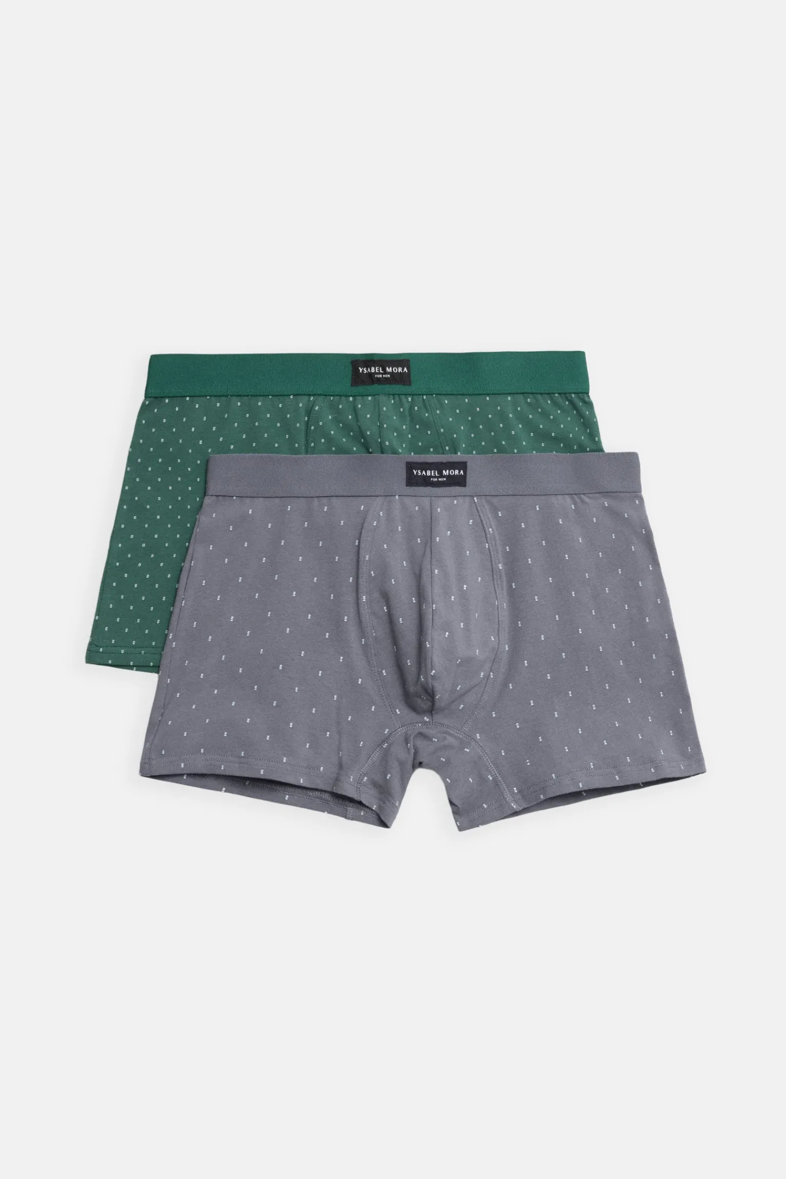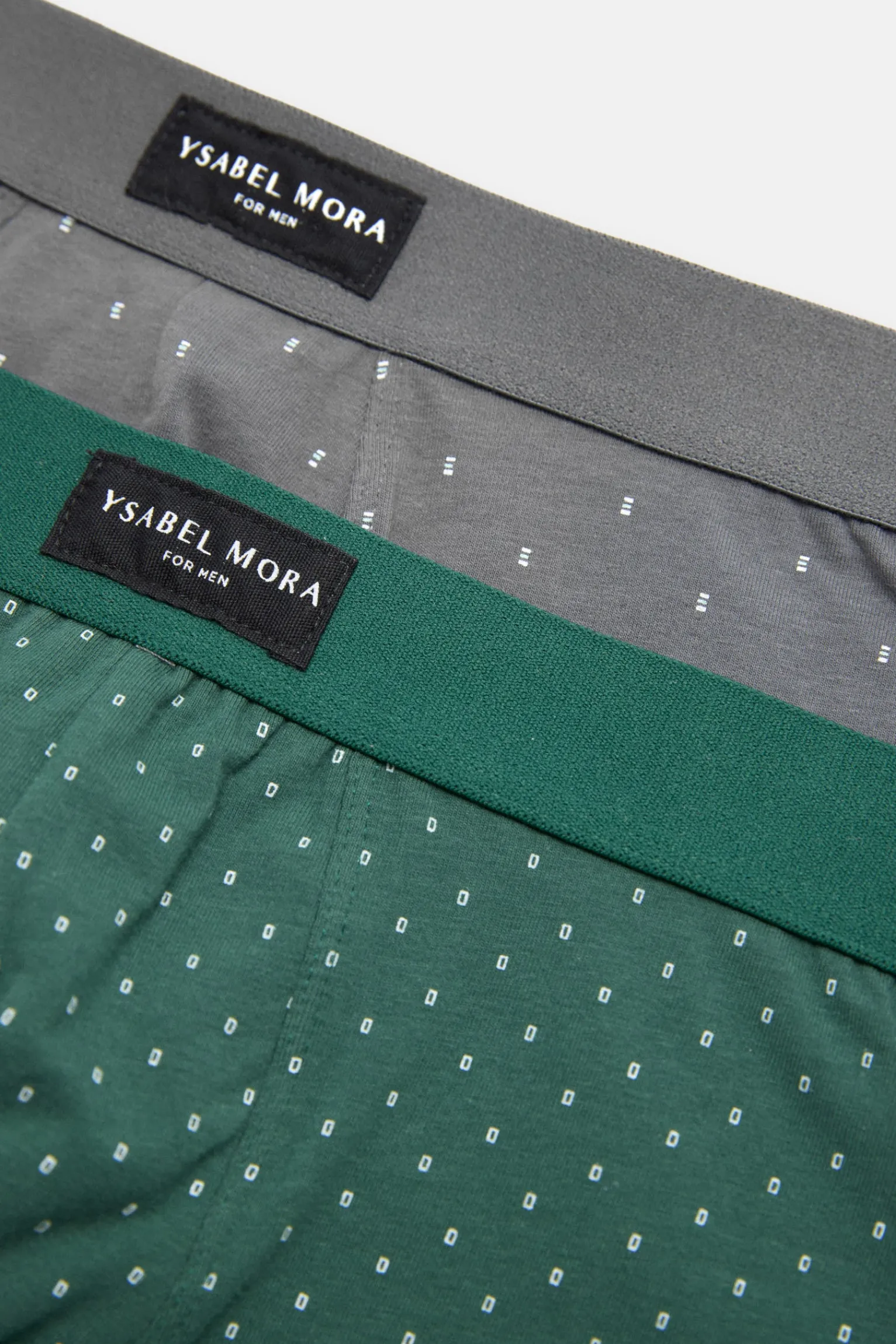 Pack de 2 bóxeres estampados de Ysabel Mora confeccionados en algodón natural. Cada modelo presenta un color y estampado minimalista diferente: uno en verde botella y otro en gris.