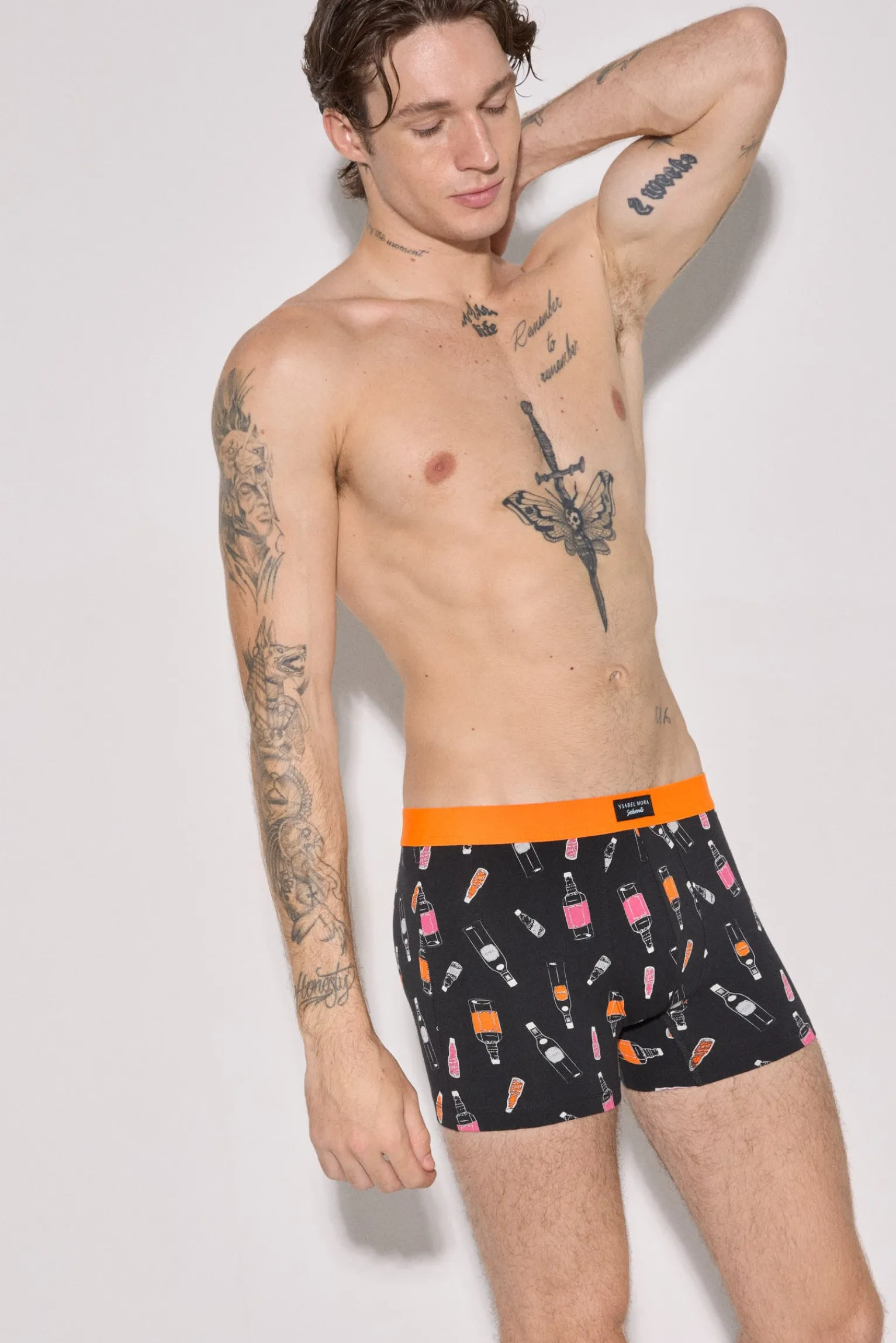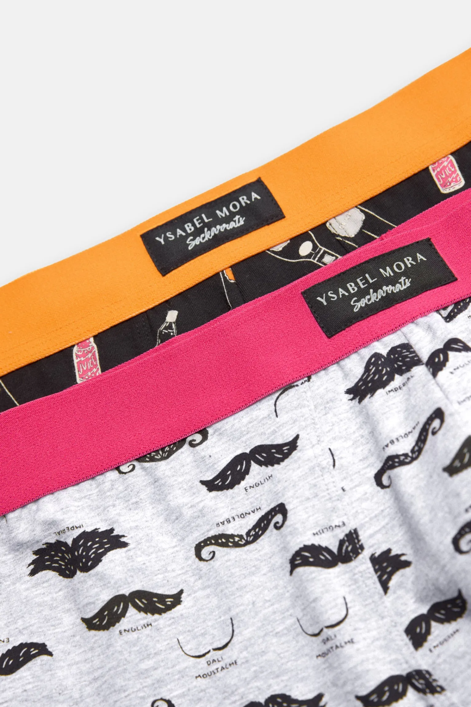 Pack de 2 bóxers estampados de la colección Sockarrats, confeccionados en algodón natural para un ajuste cómodo y transpirable. Este pack combina dos diseños únicos: uno con estampado de botellas y otro con bigotes, fiel al estilo creativo y desenfadado de Sockarrats. Una opción perfecta para quienes buscan básicos con personalidad.