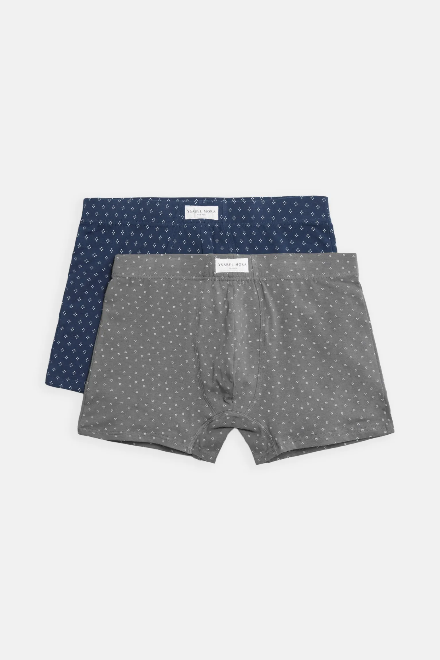 Pack de 2 bóxers estampados de Ysabel Mora confeccionados en algodón natural con un toque de elastano para mayor comodidad. Cada calzoncillo presenta un color y un estampado diferente: uno en gris y otro en azul marino. La cinturilla elástica aporta sujeción y un acabado funcional para el día a día.