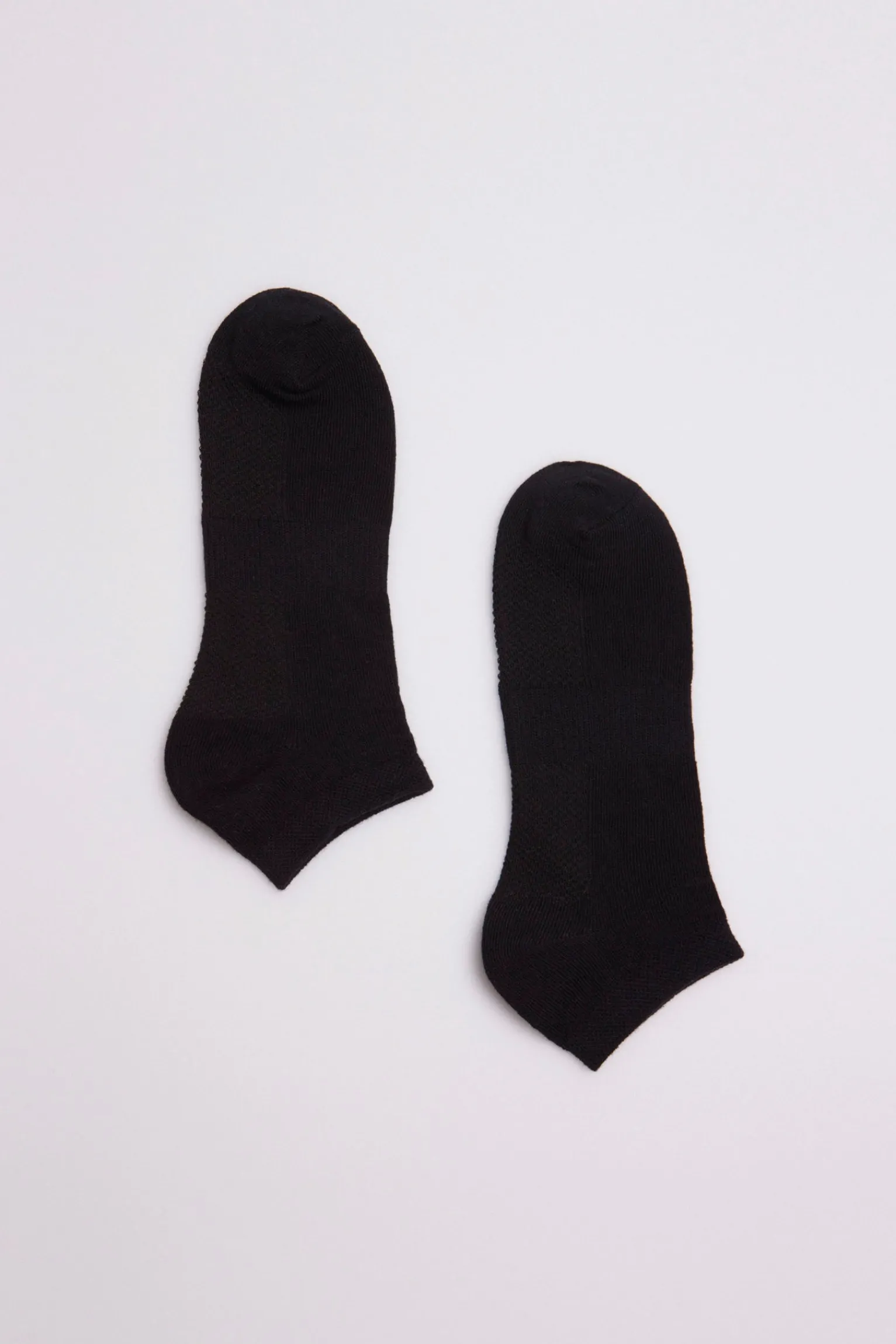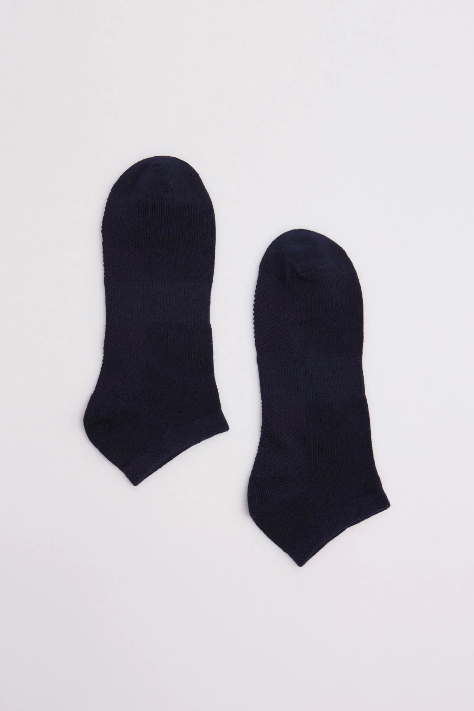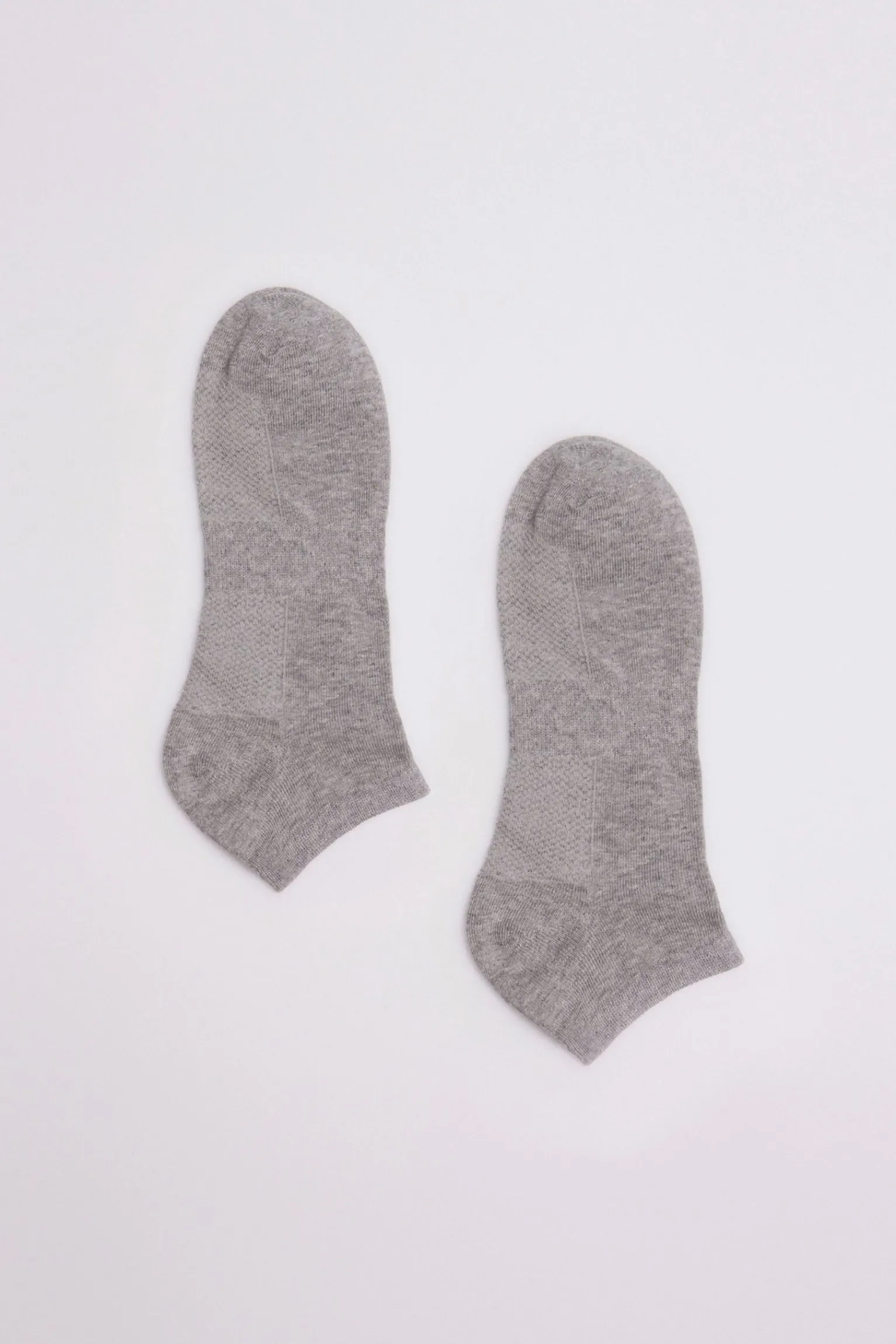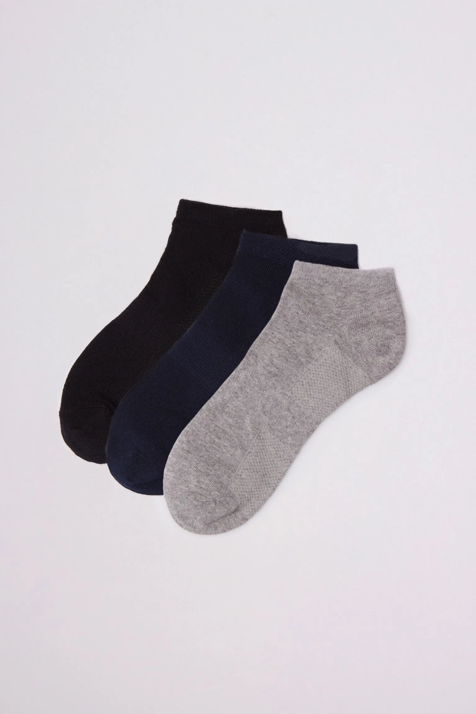 Calcetines deportivos tobilleros transpirables para mujer y hombre. Incluye un par de cada color: gris, marino y negro.