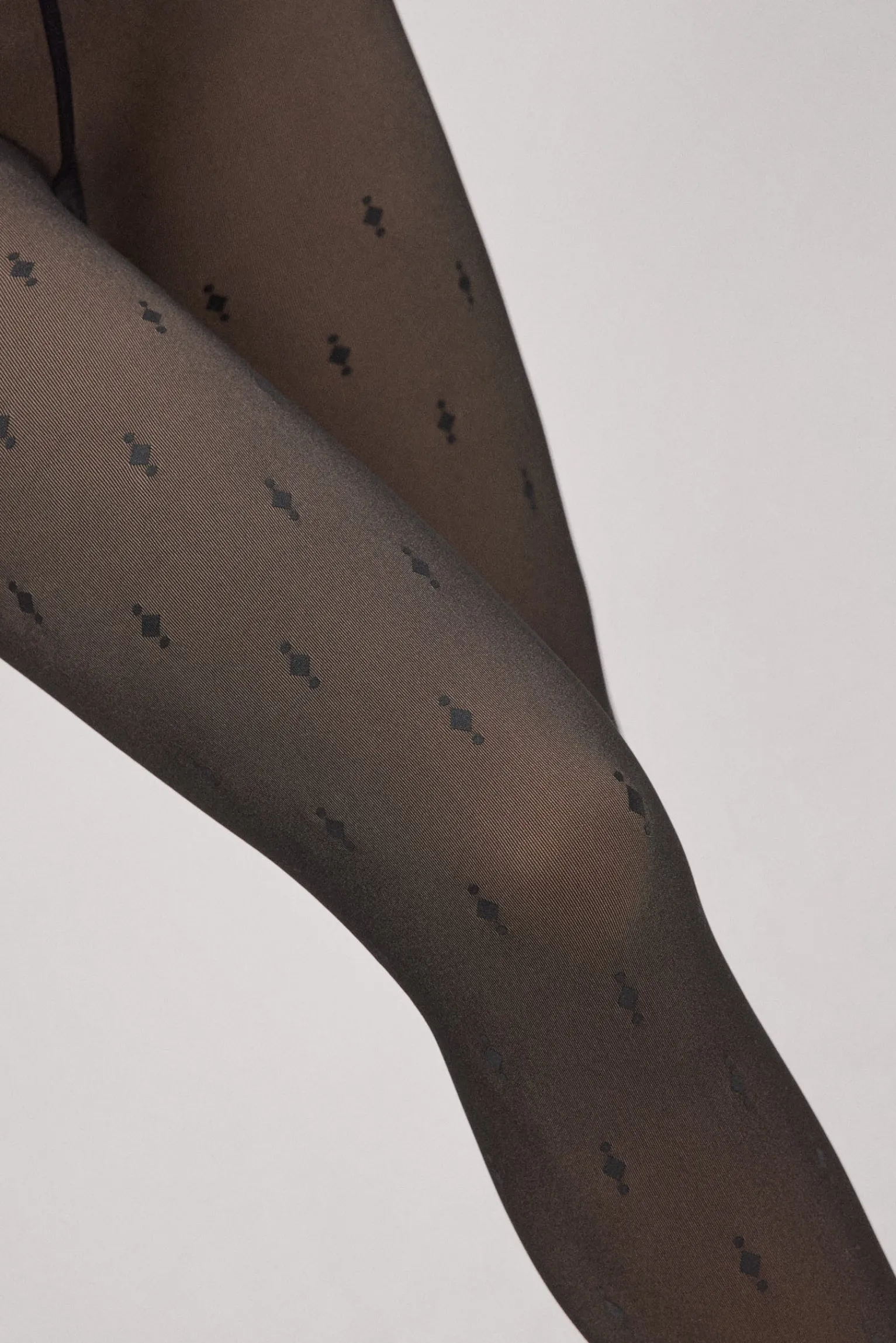 Panty térmico transparente 160 deniers con efecto velado, interior afelpado. Este modelo tiene un estampado geométrico con rombos y pequeñas esferas.