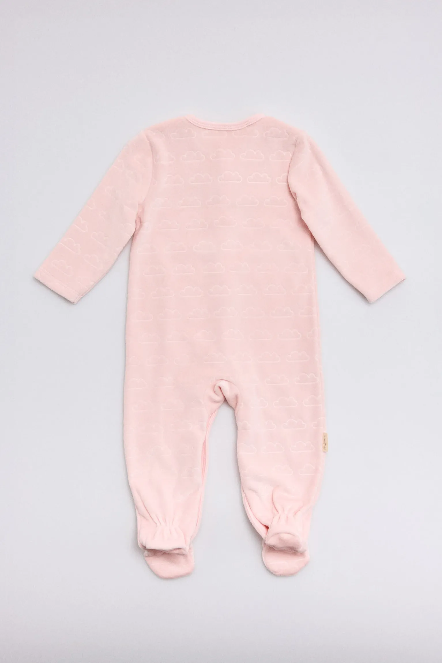 Pelele para bebé con manga larga y tejido afelpado suave. Incluye pies cerrados, Ideal para dormir o estar en casa. Diseño en tono rosa con detalle de estrellas.