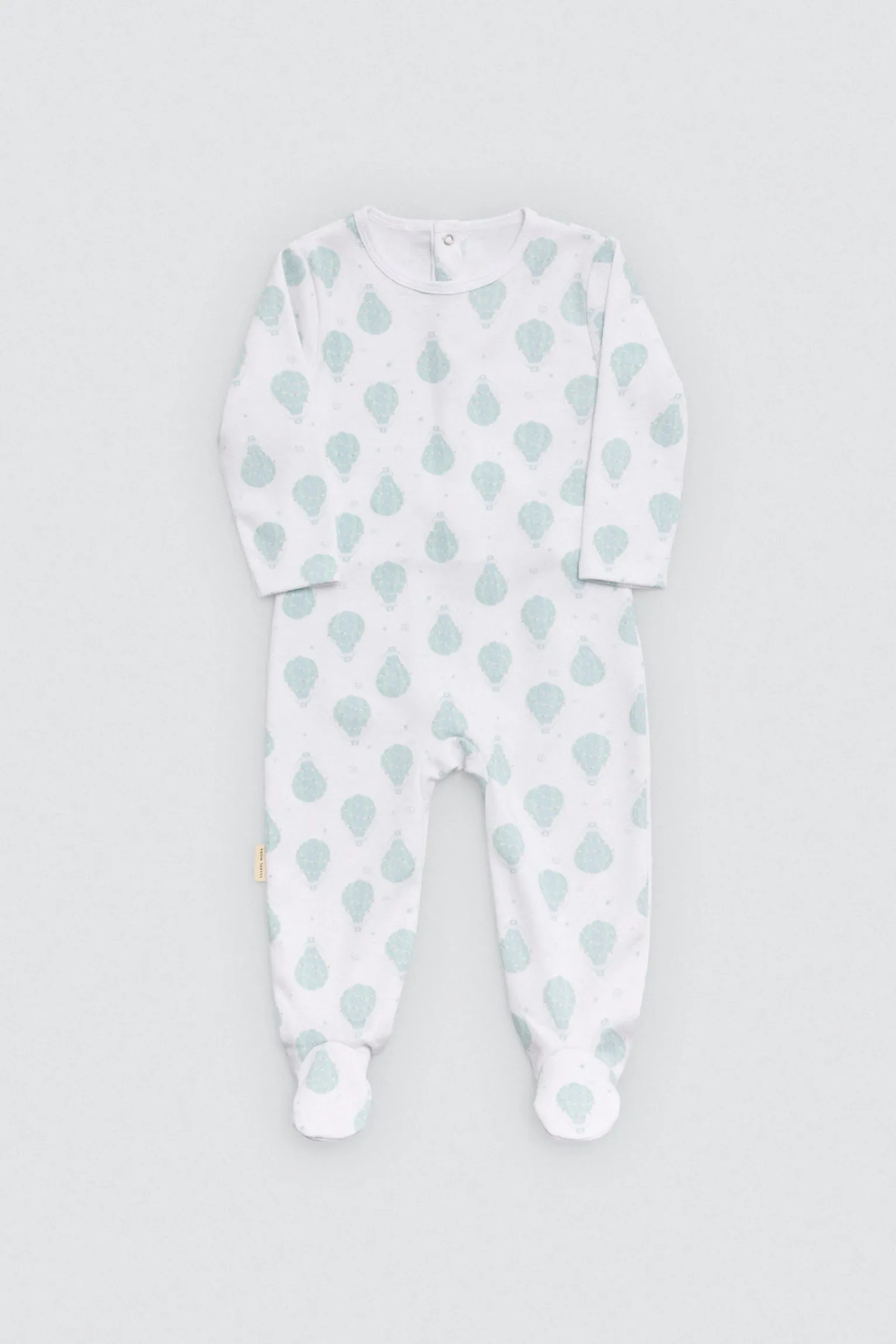 Pelele de manga larga para bebé con interior afelpado. Estampado de globos sobre fondo blanco. Ideal para bebés activos que empiezan a gatear.