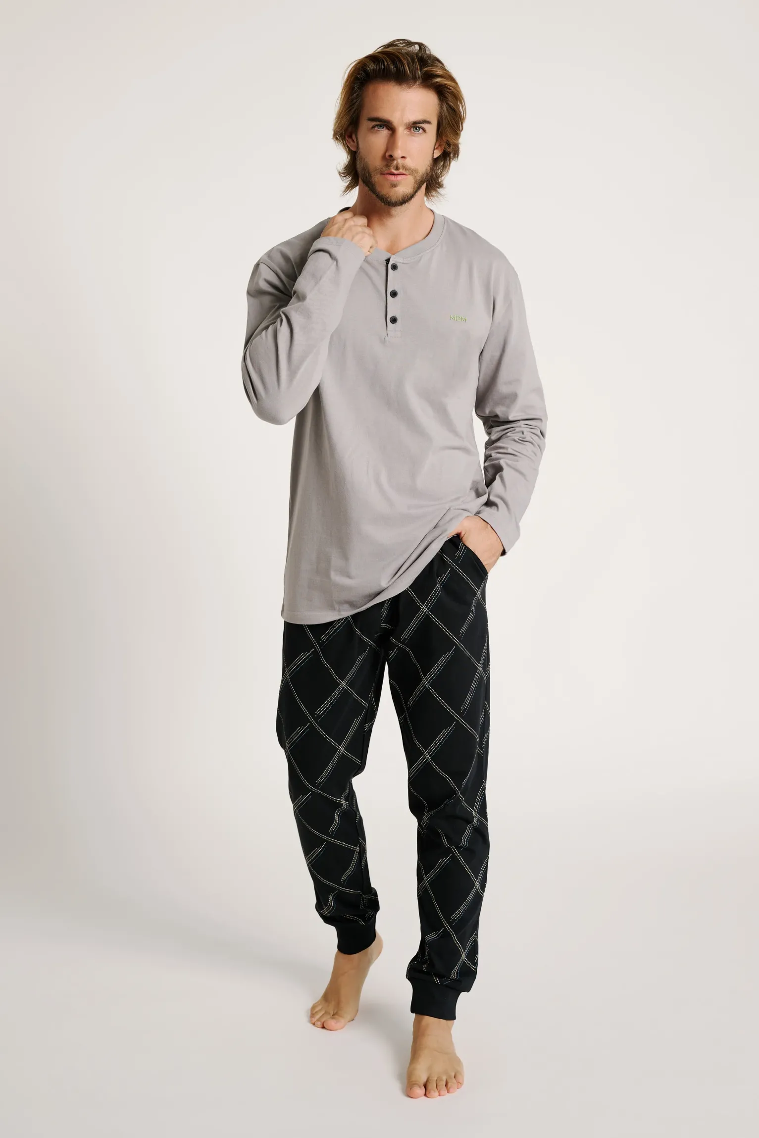 Este pijama largo de hombre combina un diseño sencillo con detalles funcionales que lo hacen perfecto para el descanso o el relax en casa.