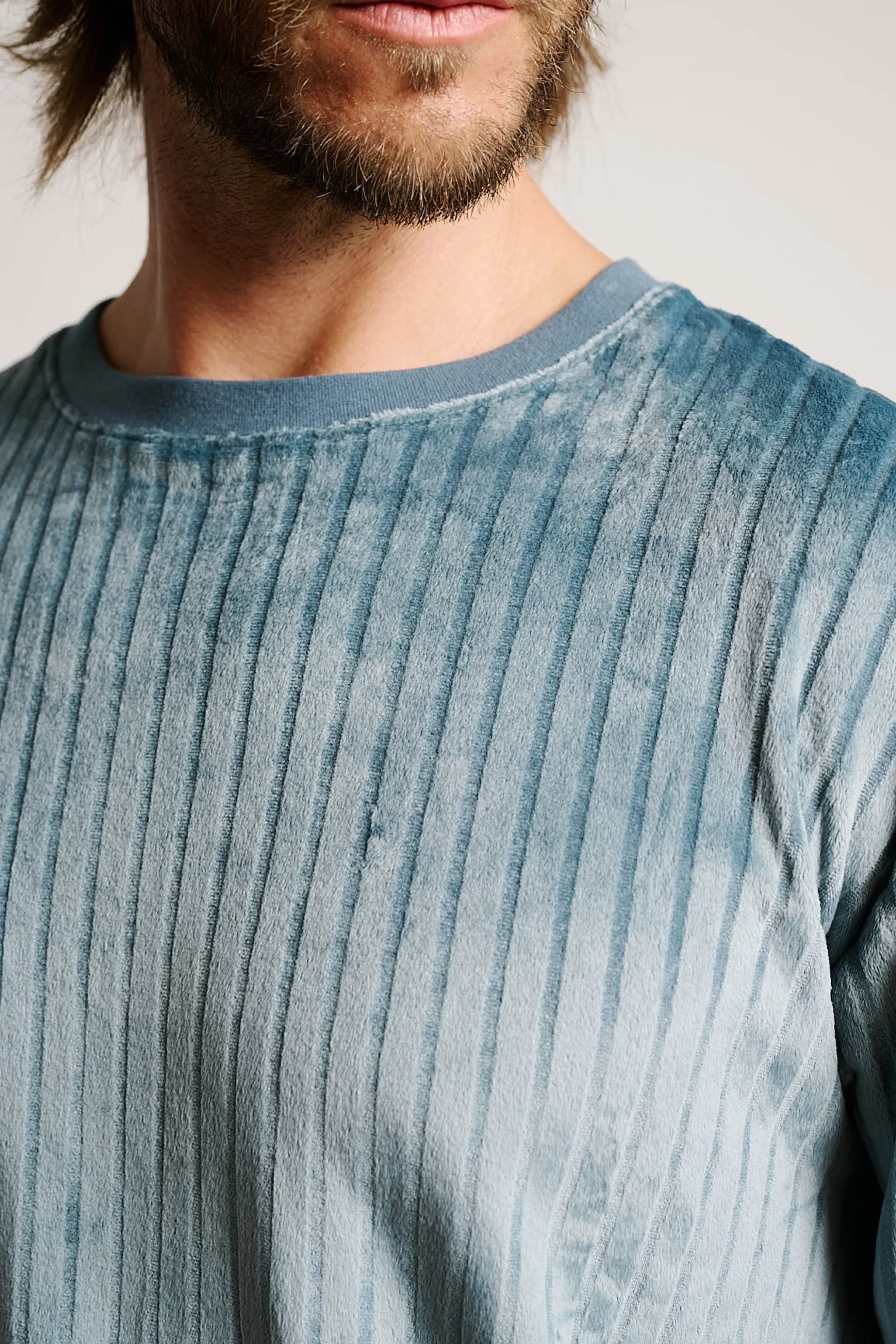 Pijama largo de hombre en tejido de tacto extrasuave con acabado aterciopelado. El diseño combina una camiseta de manga larga con textura de canalé y cuello redondo, junto con un pantalón liso a juego que incorpora bolsillos laterales y cordón ajustable en la cintura. Una propuesta muy confortable que destaca por su calidez y su estilo actual, perfecta para relajarse en casa.