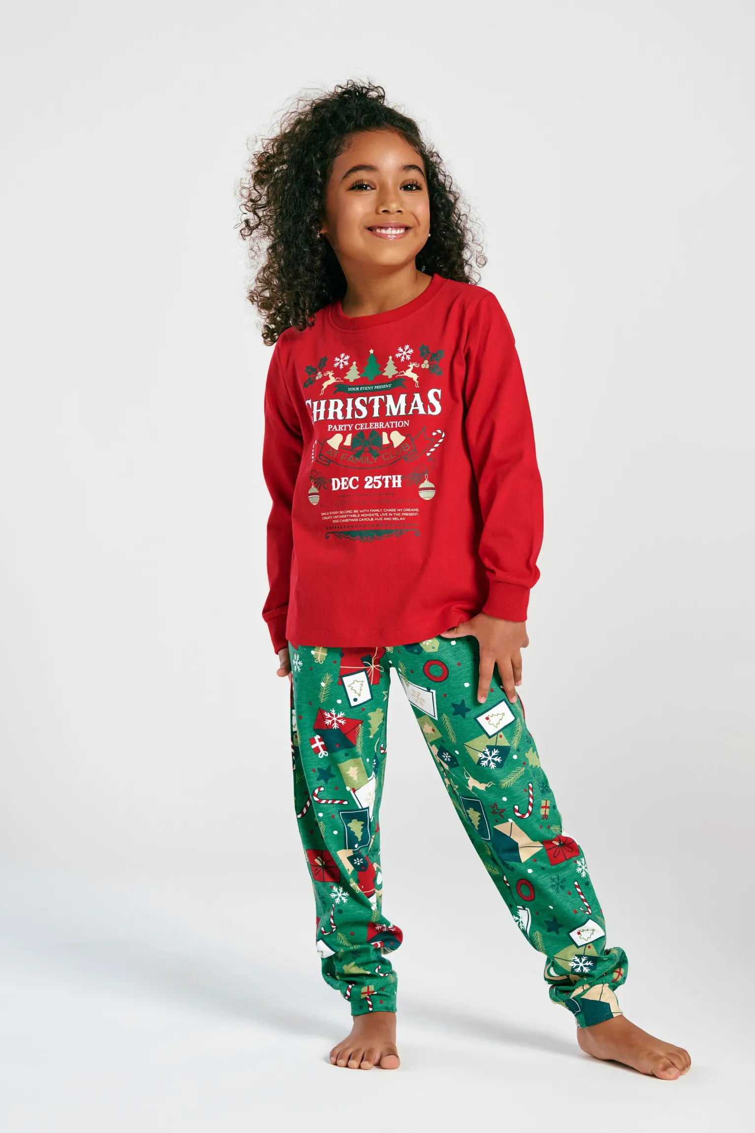 ijama largo de dos piezas ideal para celebrar la Navidad con estilo y comodidad. La camiseta de manga larga, en vibrante color rojo, luce un alegre estampado frontal con el texto “Christmas Party Celebration” acompañado de motivos navideños. El pantalón largo, en color verde, está decorado con un divertido estampado de sobres, copos de nieve, bastones de caramelo y otros elementos festivos. Confeccionado en tejido suave y agradable al tacto, es perfecto para disfrutar de las noches de invierno y vivir el espíritu navideño en casa.