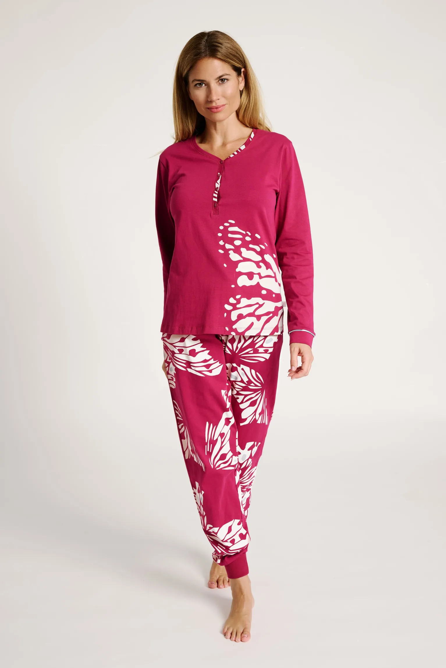 Pijama largo de algodón con camiseta de manga larga en color granate y estampado de hojas blancas. Cuello redondo con botones decorativos y pantalón a juego con puño en el bajo para mayor comodidad. Ideal para noches de descanso con estilo y confort.