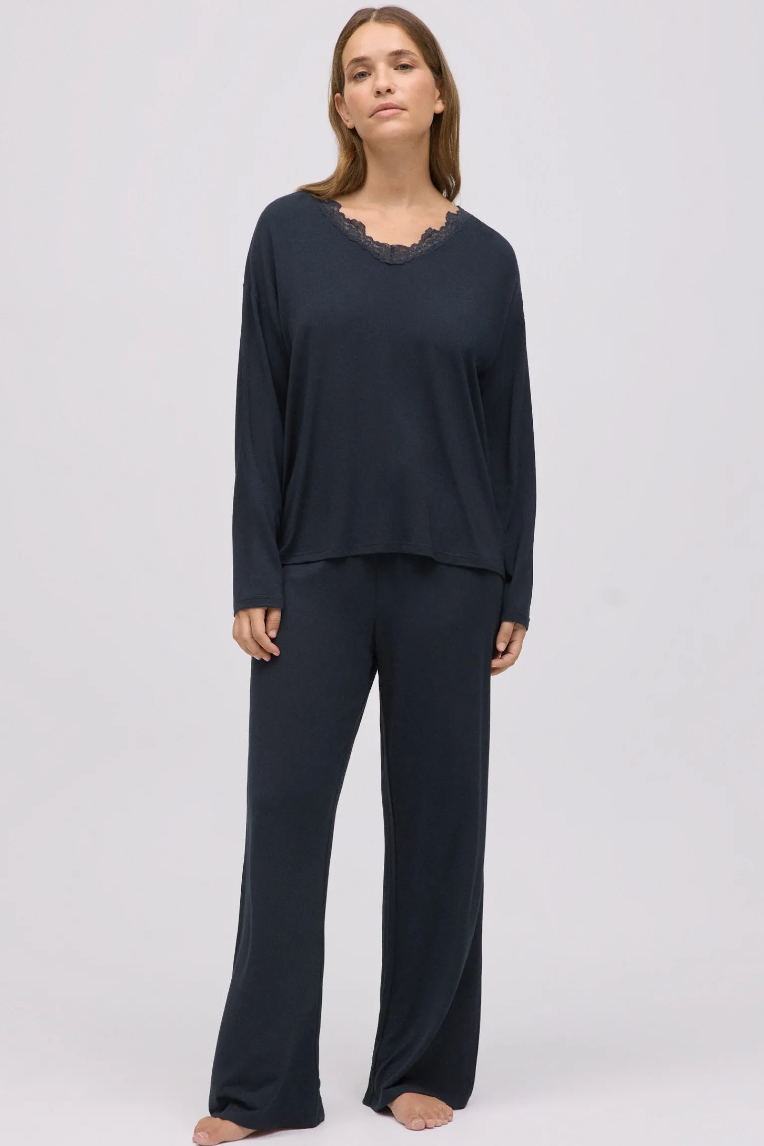 Descubre la elegancia del descanso con nuestro pijama largo de modal ultra suave, diseñado para envolver tu piel en una caricia de confort. Este conjunto de camiseta de manga larga con escote en pico y delicados detalles de encaje se combina con un pantalón ancho fluido, creando un look sofisticado y relajado para tus noches.