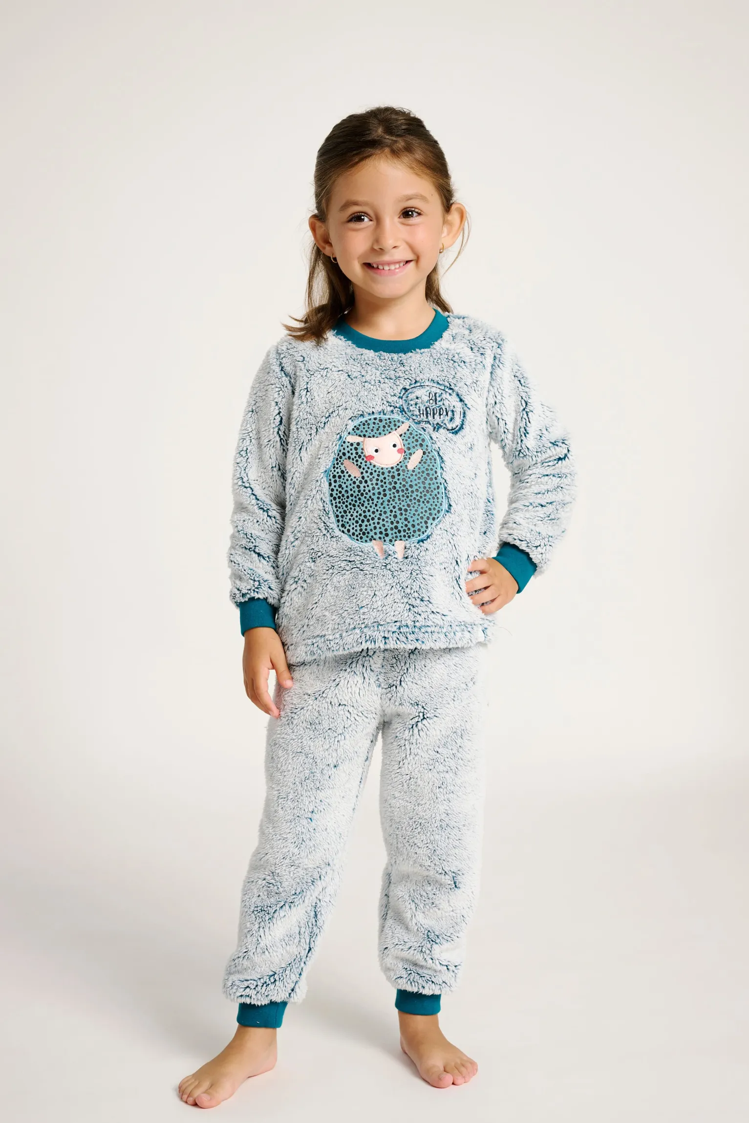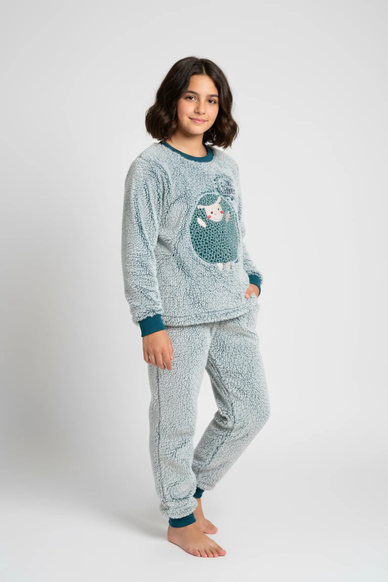 Pijama juvenil de dos piezas confeccionado en suave tejido polar de tacto aterciopelado, ideal para mantener el calor en las noches más frías. La camiseta de manga larga, en color jaspeado blanco y azul, luce un divertido estampado central de una oveja con mensaje “Sleep Tight”. El pantalón largo, a juego y con cintura elástica, ofrece un ajuste cómodo y libertad de movimiento. Un conjunto cálido, acogedor y lleno de ternura para el descanso de los más pequeños.