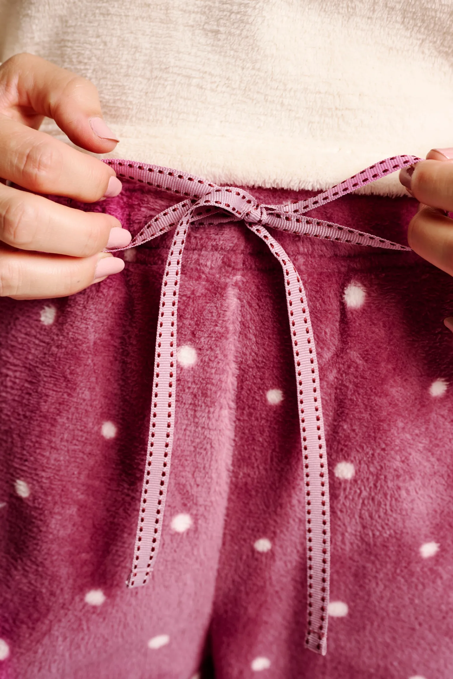 Este pijama de invierno combina la suavidad del tejido polar con un diseño entrañable. La parte superior, en color crema, destaca por el estampado frontal de un simpático erizo con corazón, mientras que el pantalón, en color burdeos, presenta un patrón de pequeños lunares blancos. Con puños en las mangas y tobillos, ofrece un ajuste cómodo que retiene el calor, ideal para las noches más frías.