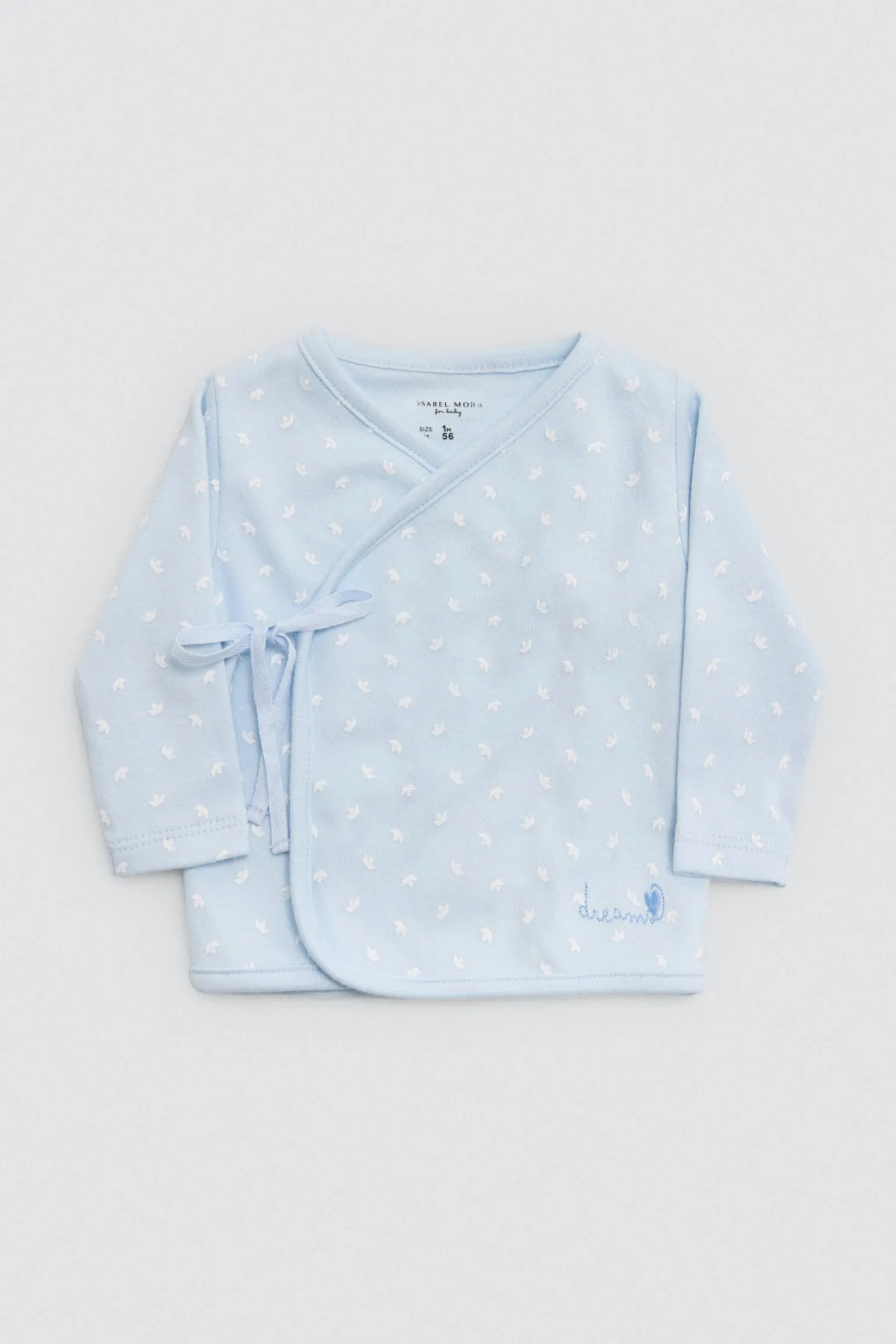 Conjunto completo para la primera puesta del bebé niño. Compuesto por 4 piezas: camiseta cruzada, polaina, gorro con nudo y manoplas. Fabricado en algodón natural, ideal para los primeros días por su suavidad y calidez.