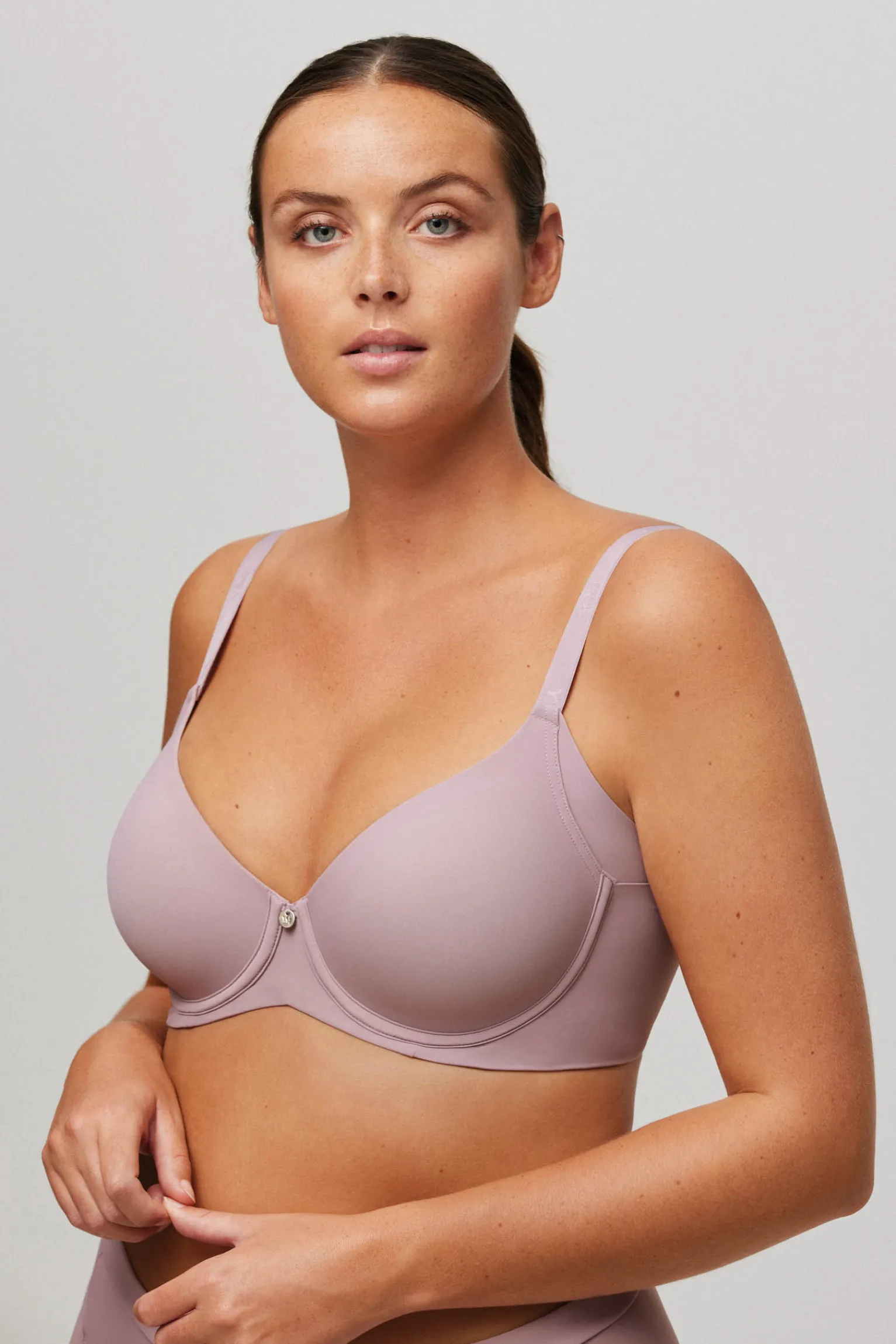 Sujetador básico de capacidad con aro reforzado y relleno. Diseño de espalda con forma anatómica y refuerzo en zona lateral para mejor sujeción. Cierre trasero con corchetes y forrado para evitar rozaduras para mayor confort. Tirantes regulables con ajustes metálicos para graduar a diferentes alturas y adaptase a todas las siluetas. Colo lila aurora.
