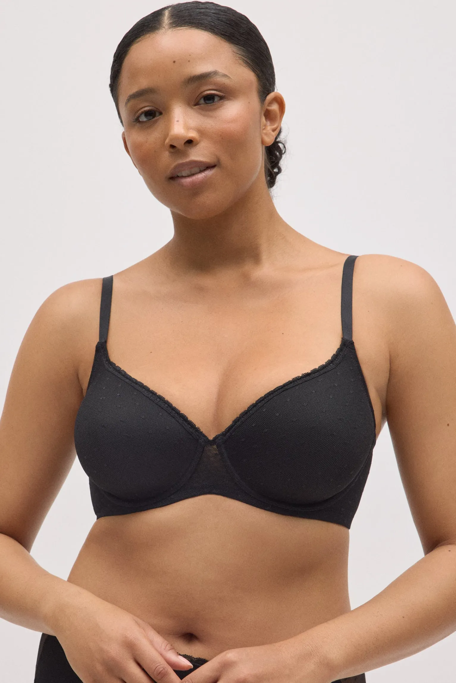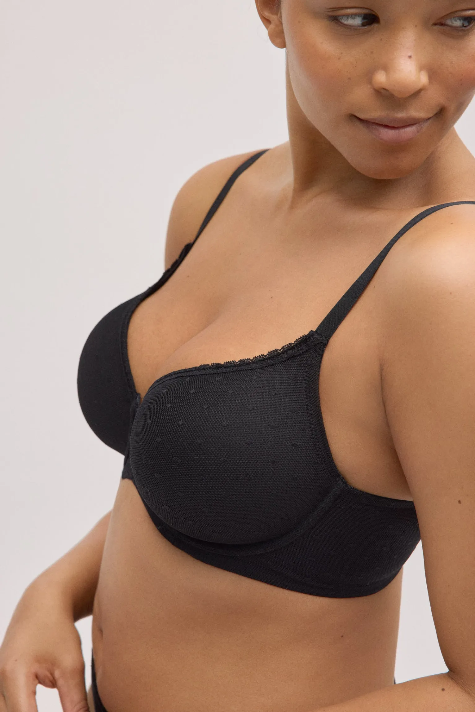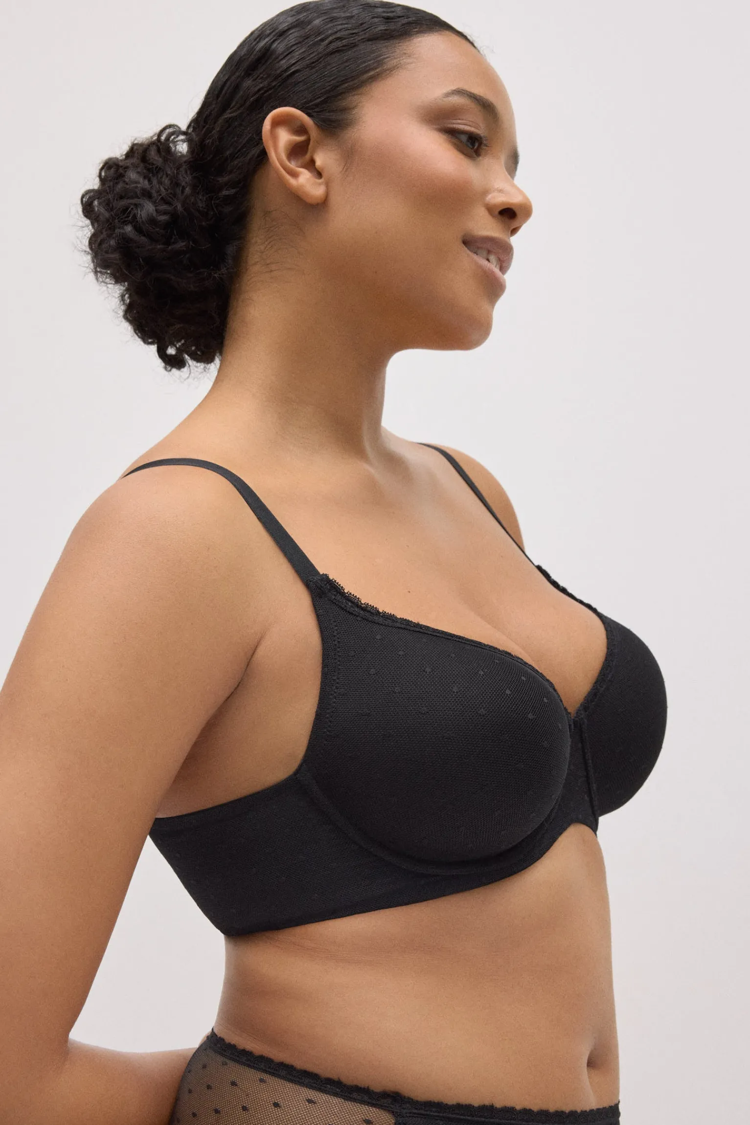 Sujetador de capacidad con aro y relleno que envuelve el pecho y aporta una sujeción excelente en copas C y D. Confeccionado en tejido plumeti con delicados detalles que suman un toque elegante y femenino. En un versátil color negro, perfecto para el día a día.