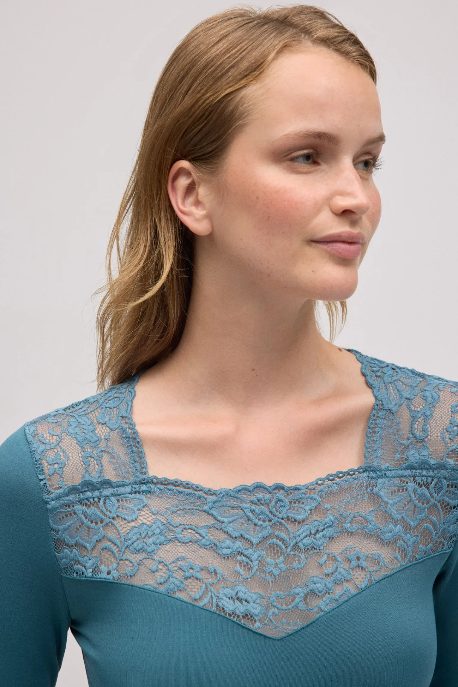 Camiseta térmica de manga larga para mujer con elegante cuello cuadrado y detalles de encaje en el escote y los puños. Confeccionada en tejido térmico suave, proporciona un nivel de termicidad que ofrece confort y calidez en días fríos sin sacrificar el estilo. Su diseño liso y femenino la convierte en una prenda versátil, perfecta para lucir como interior o como parte de un look casual invernal.
