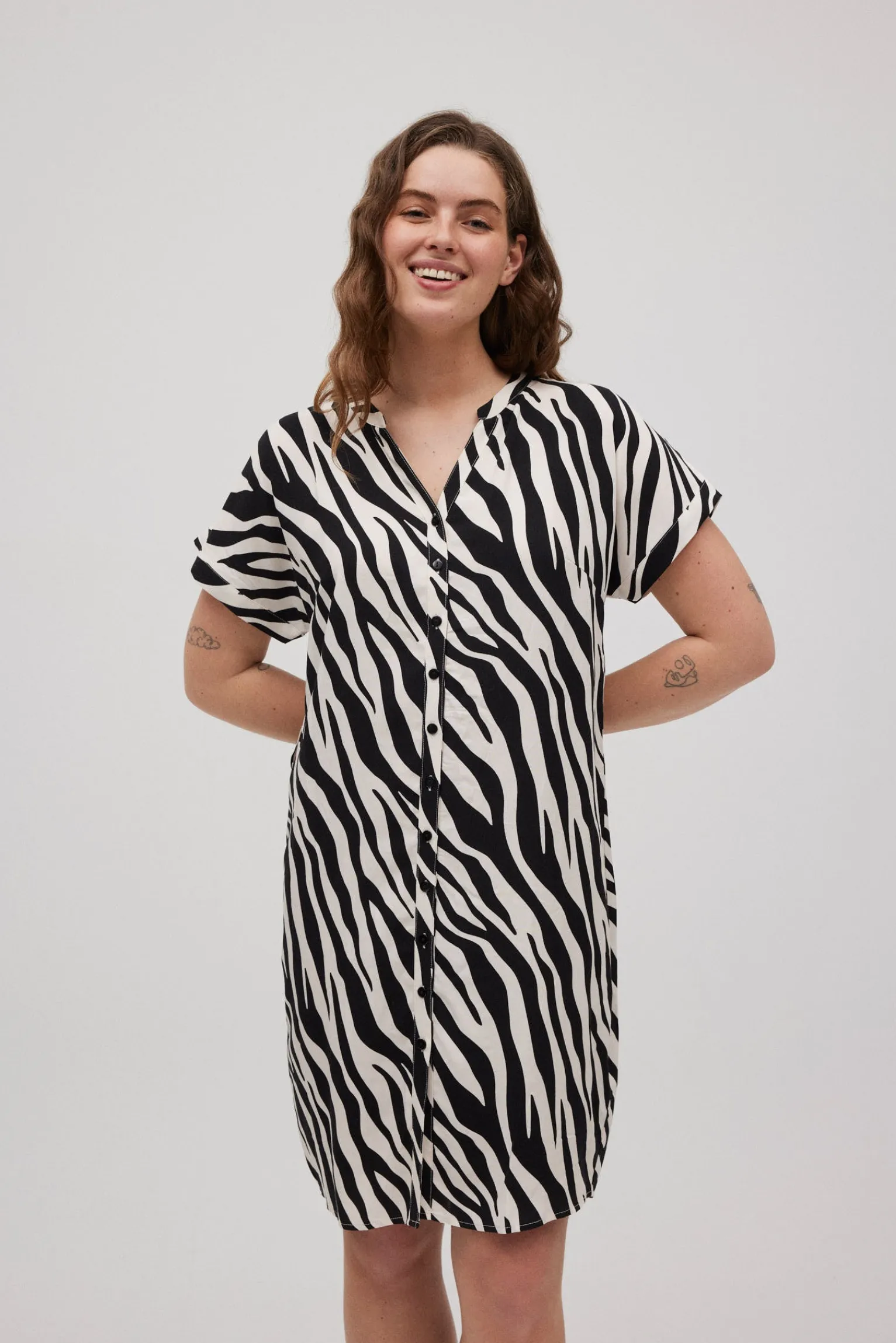 Vestido midi estilo camisero con estampado de cebra. Botones en la parte delantera y cinturón para poder ajustarlo a tu medida para marcar la cintura y darle un toque más elegante. Tejido fresco y ligero. Combínalo con un bikini y un bolso a conjunto de la colección.